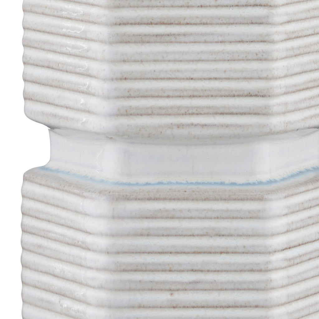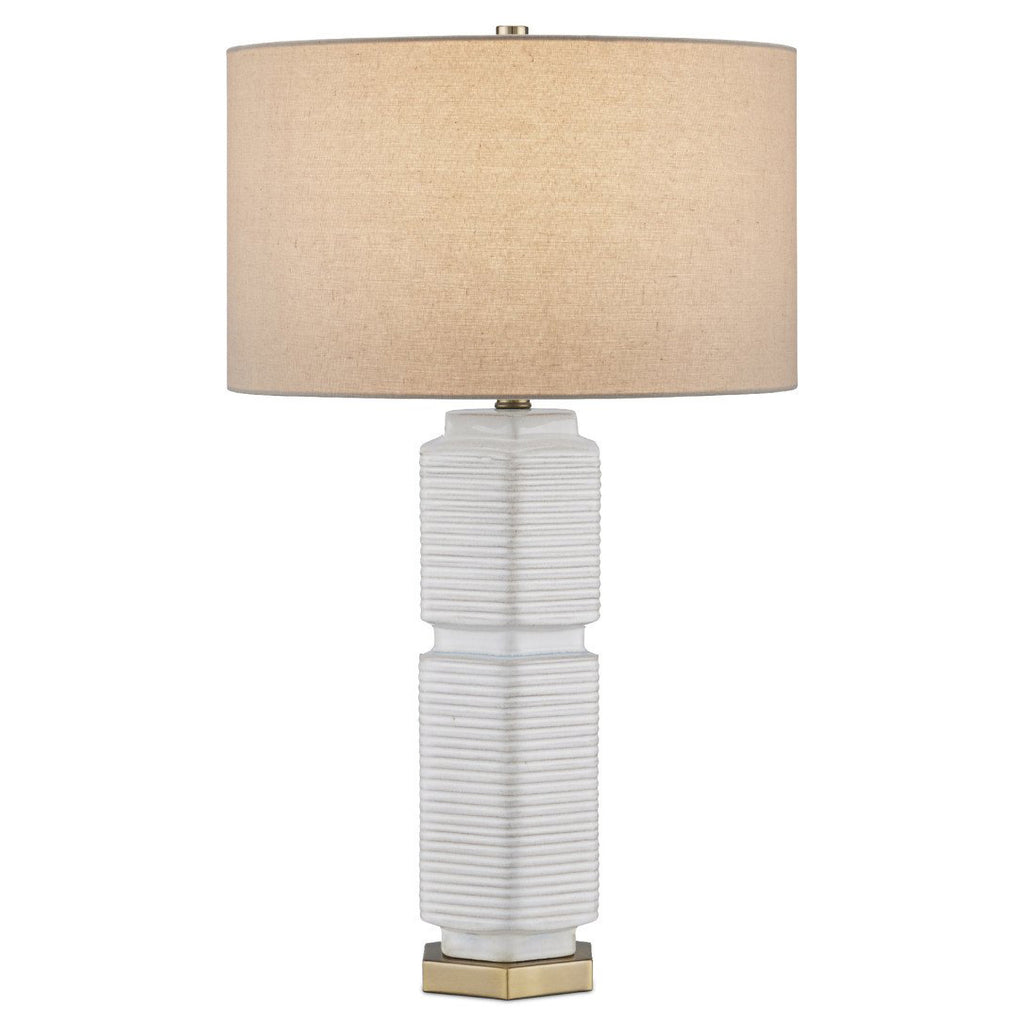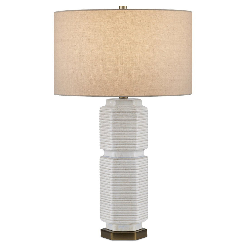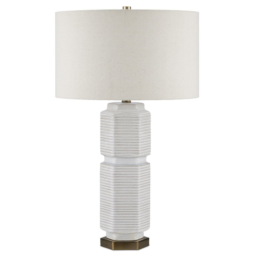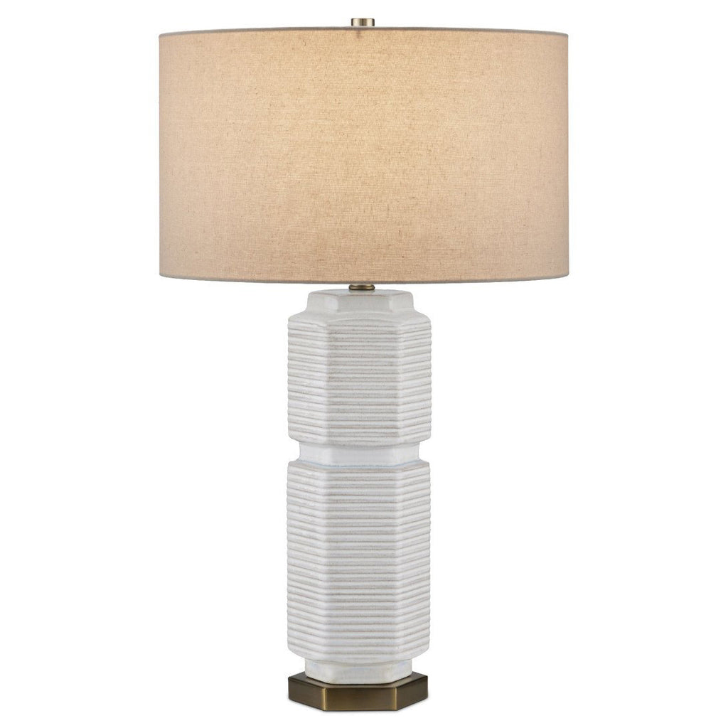 The Glebe Table Lamp has a hexagonal shape made of ceramic with a white glaze withvery subtle hints of beige and blue. The geometric complexity of this white lamp is heightened by the striated lines pressed into it and the indentions at the base, near its center, and as the body meets the hardware at the top. The base, hardware, and finial in an antique brass finish are warm elements to the design, as is the textural shade.