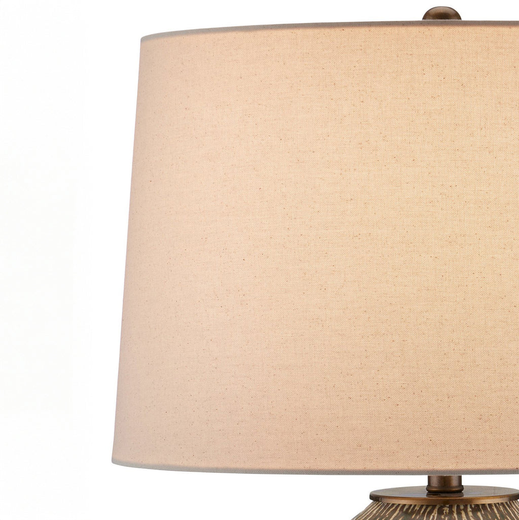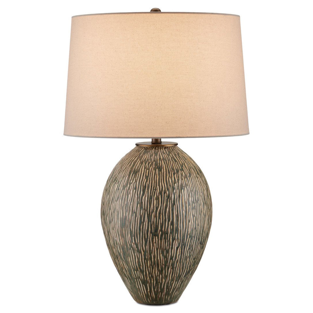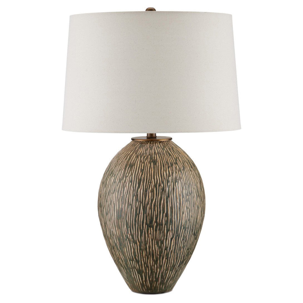 The Hildreth Table Lamp is awash in a textural pattern in an olive green and beige color combination. Made of porcelain, the dark green lamp gains a sense of movement from the flowing lines that ornament its surface. The fact it culminates without a base, and has an antique brass finish on the hardware and finial brings this composition great warmth.