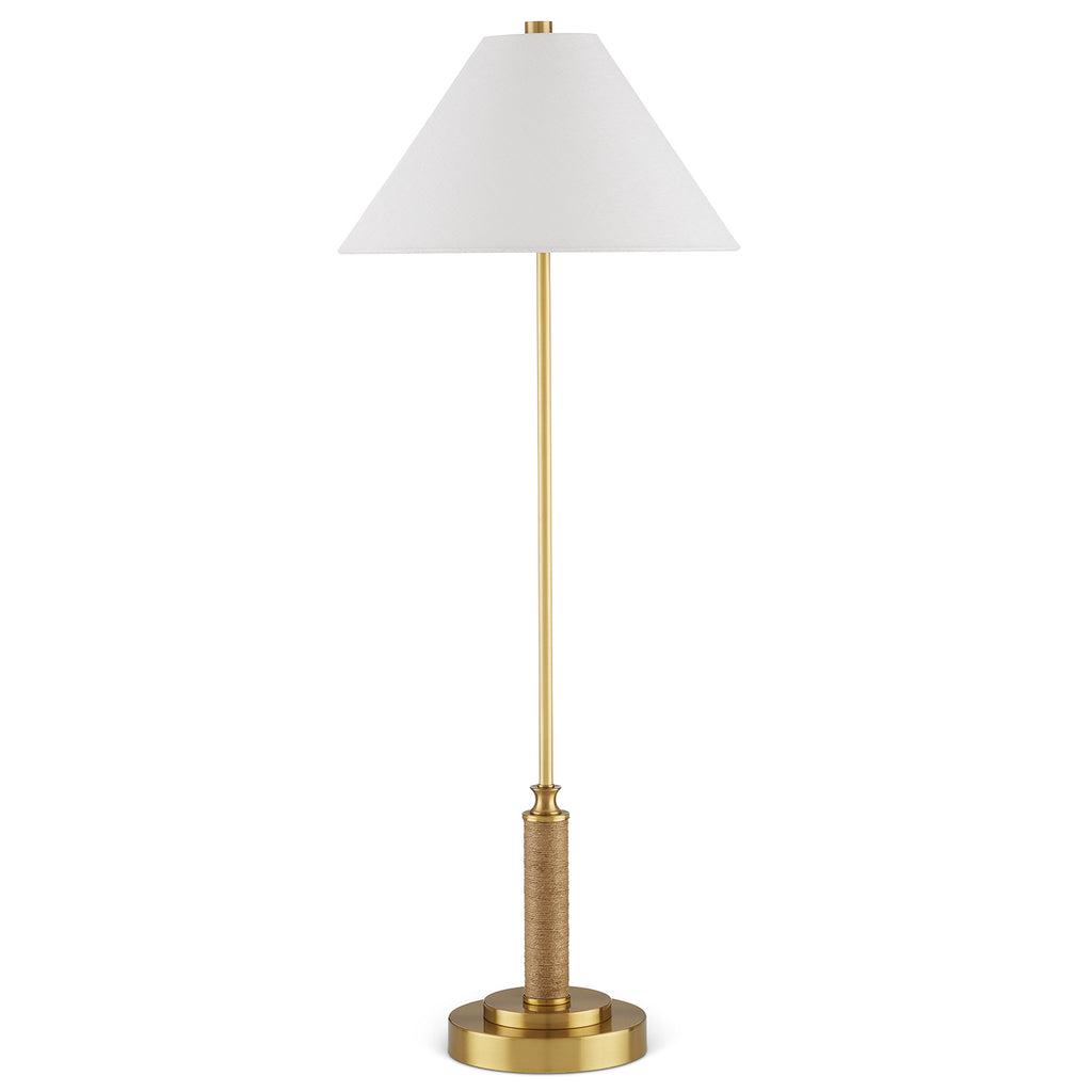Tom Caldwell created a light profile for the Ippolito Brass Console Lamp and wrapped a portion of the stem near the base in jute rope. The stacked base, the rings that flank the rope, the long thin stem, and the finial are in an antique brass finish. The off-white linen shade is a pale element on the dressy console lamp that was designed to be a decorative and functional accent in a space.