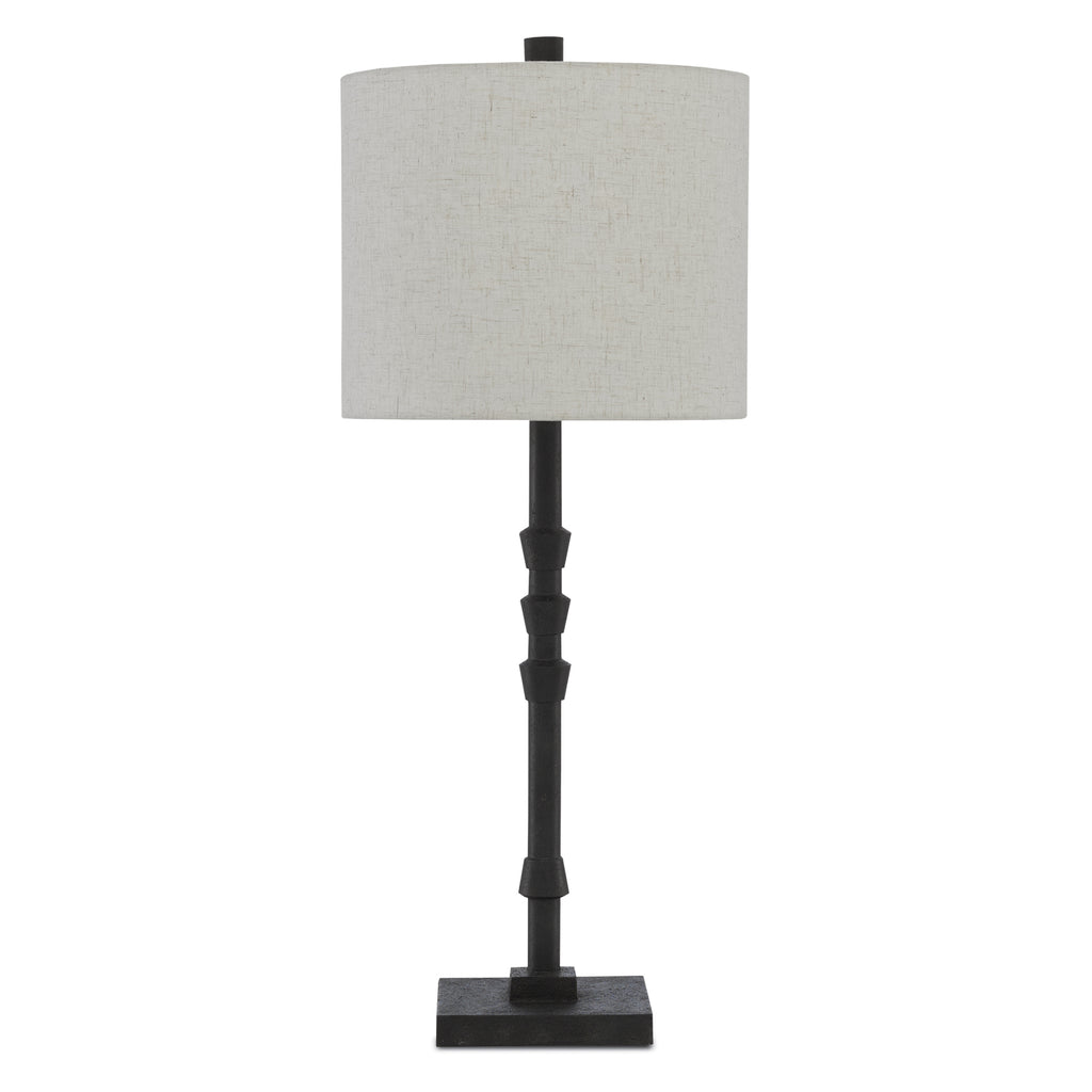 The mark of a talented designer is shown in the makeup of the Currey & Co Lohn Table Lamp. The ornamentations on the thin stem have a balance to them that pleases the eye three upturned fluted motifs pointing toward the shade and one pointing toward the simple stacked base. Topping the cast-iron piece off, above the beige poplin shade, is a finial that has the same tonal qualities as the body of the lamp, which reads as black but has the subtlest of hints of dark brown texture to it.