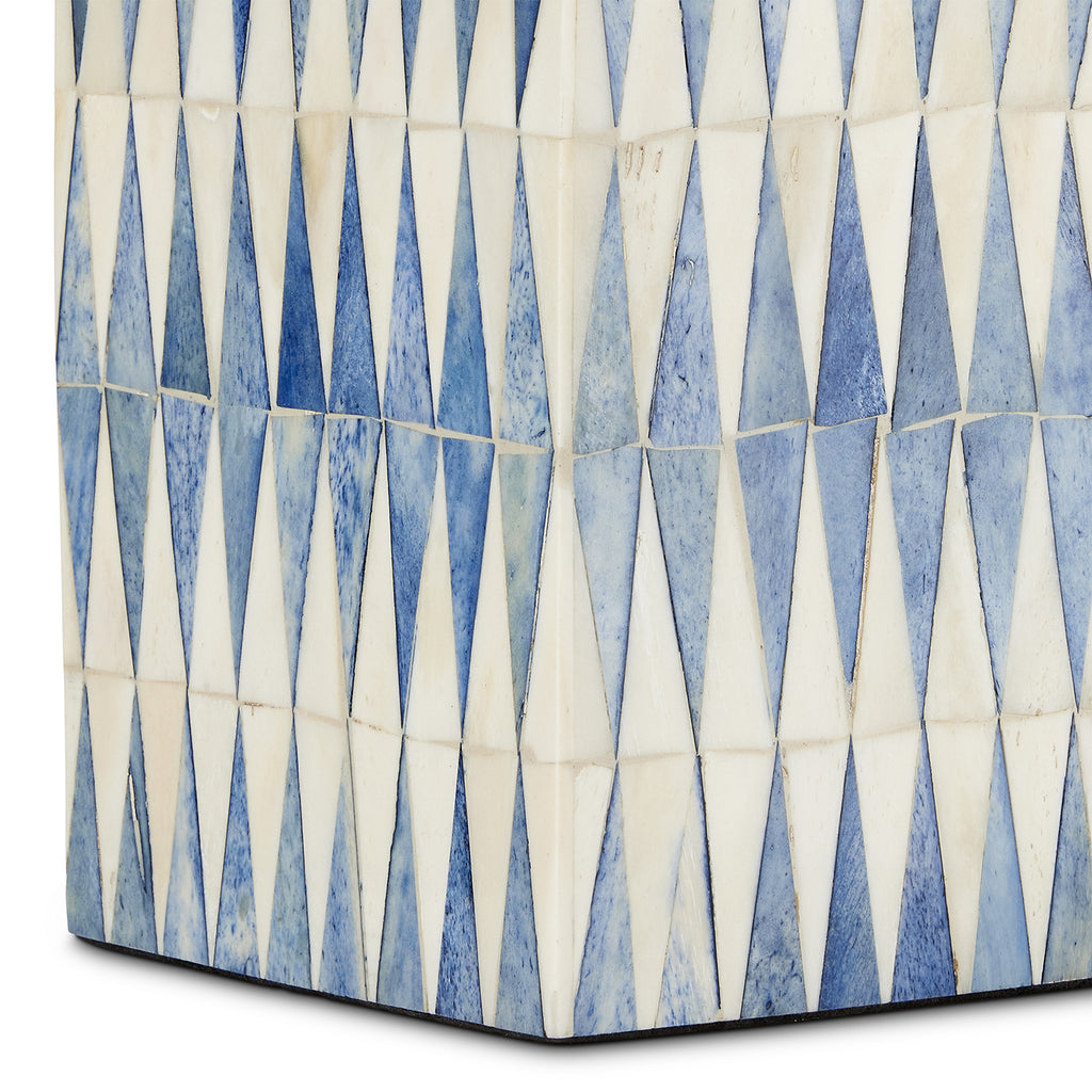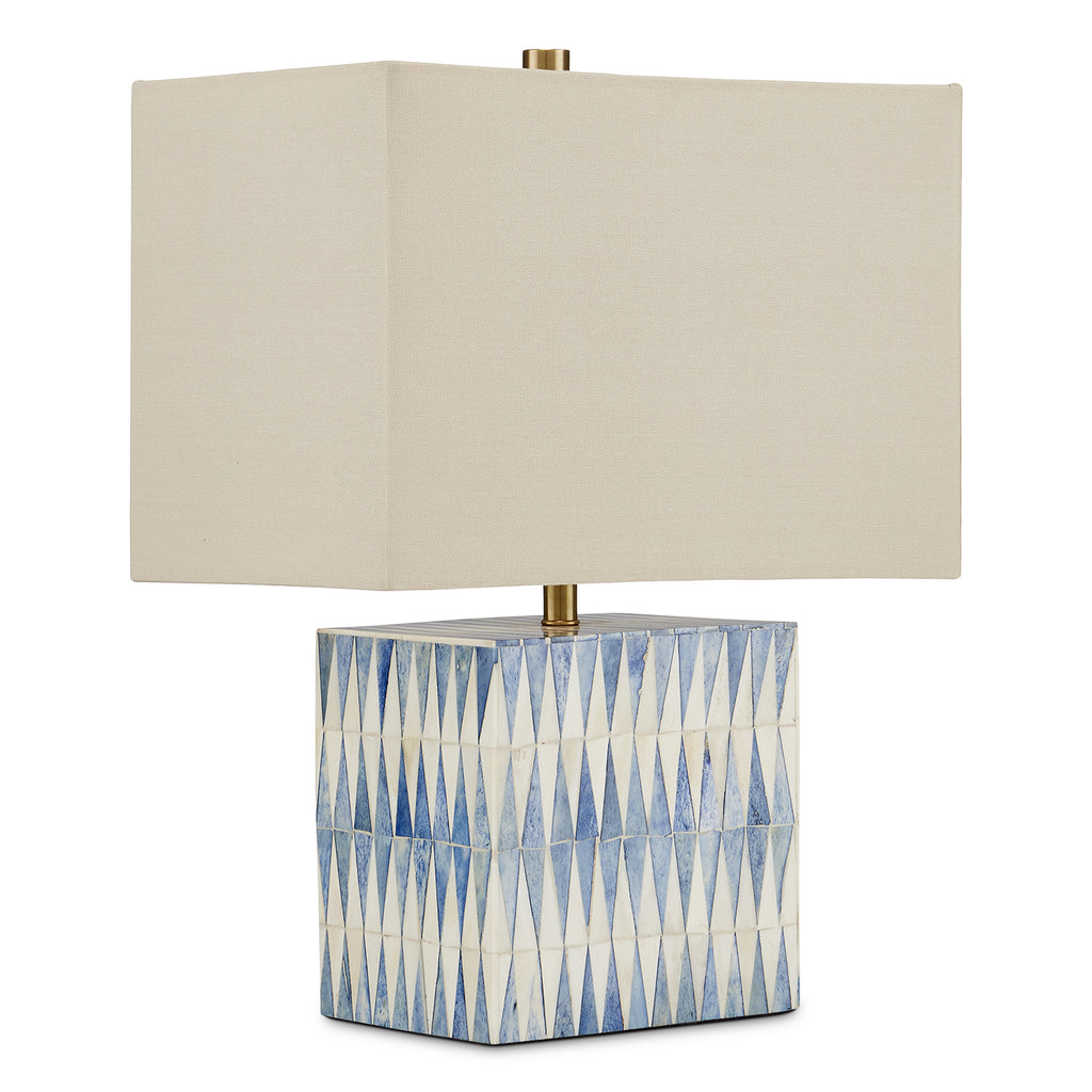 The Nadene Blue & White Table Lamp is a decorative table lamp made of alternating colors of bone. The jagged pattern is created when blue and ivory bone are hand-applied to the surface, which makes the blue table lamp an artisanal accent that packs a textural punch. The generous size of its rectangular shade made of light beige linen adds to the sophistication of the square lamp's profile. This complex composition was designed by Aimee Kurzner.