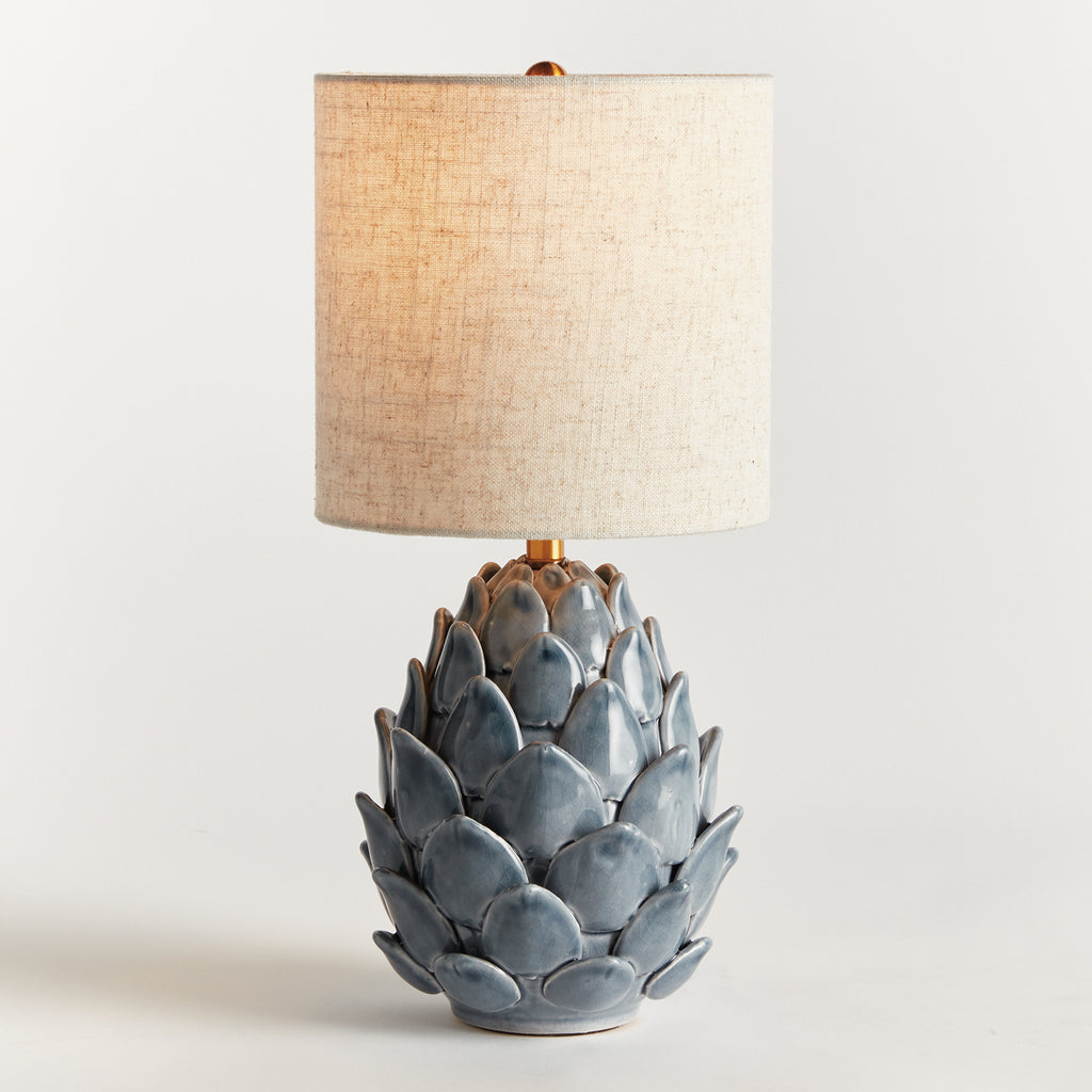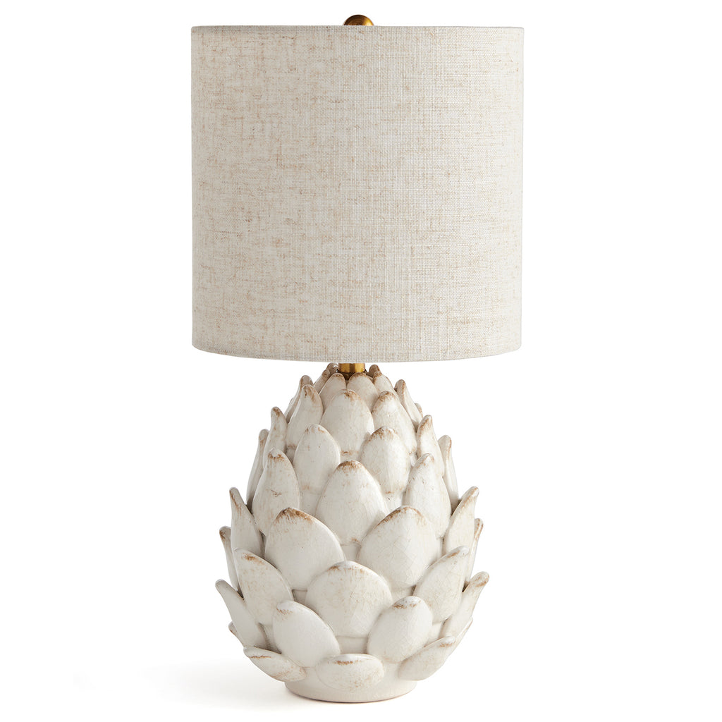 This stunning artichoke-inspired ceramic lamp is hand finished with antiqued edges. Topped with a natural linen shade, it makes a beautiful addition to the traditional space.