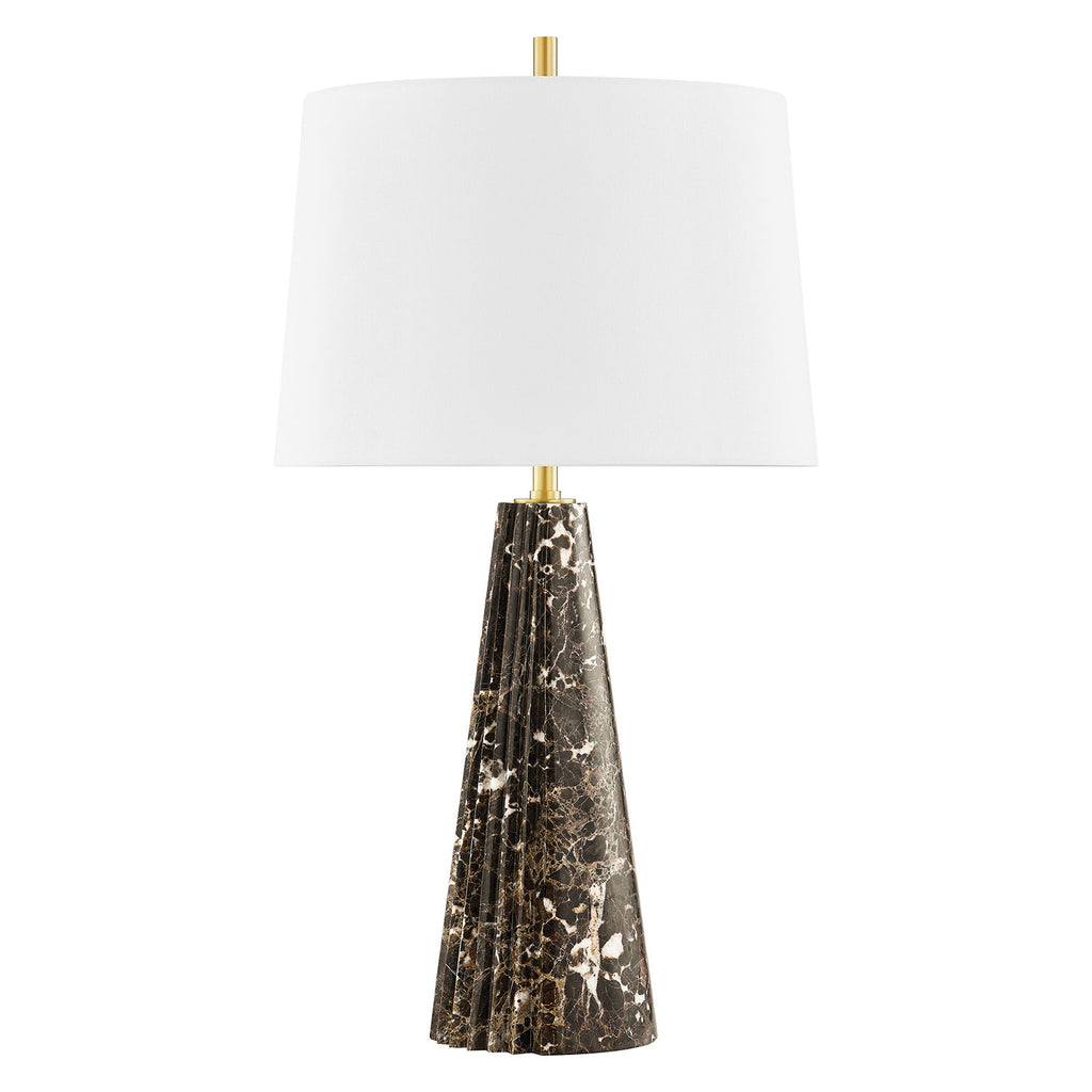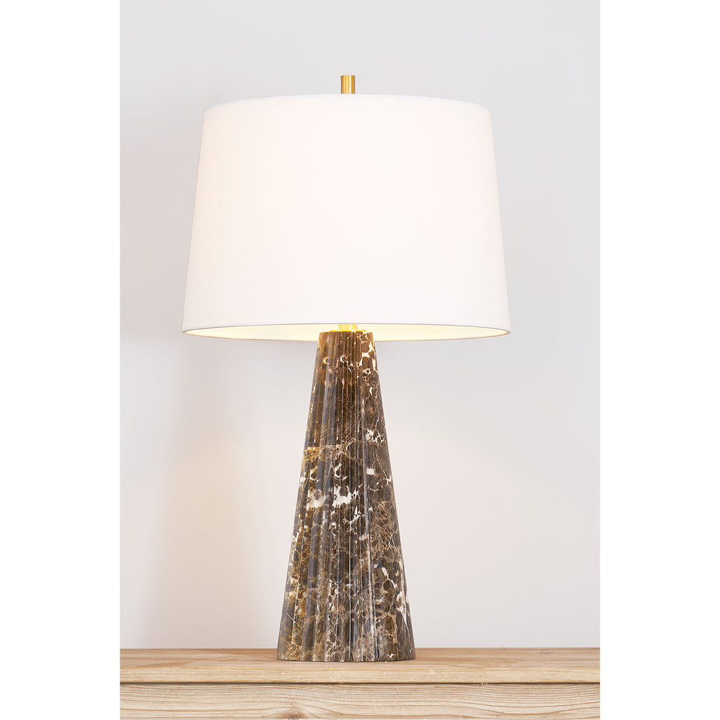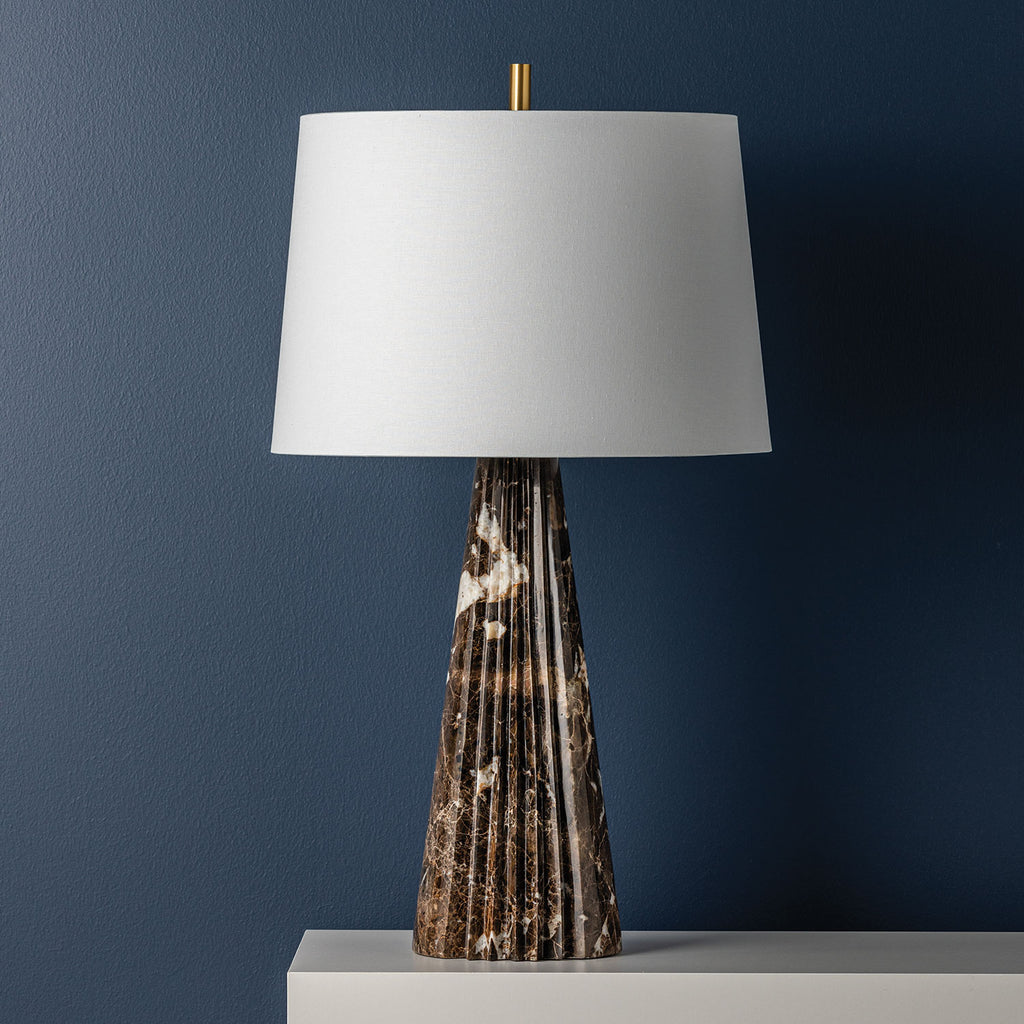 Renowned for built-to-last quality with a timeless feel, Hudson Valley offers a modern lighting collection with elegant touches, recalling vintage inspiration. Crafted from lustrous dark Emperador marble, the gently tapered cone shape of this table lamp is fluted to provide a sense of depth. With unique pattern variations, the dark-hued marble is highly reflective, interacting with light to create areas of shine and shadow. An off-white linen shade in a classic drum shape adds a fresh finishing note.