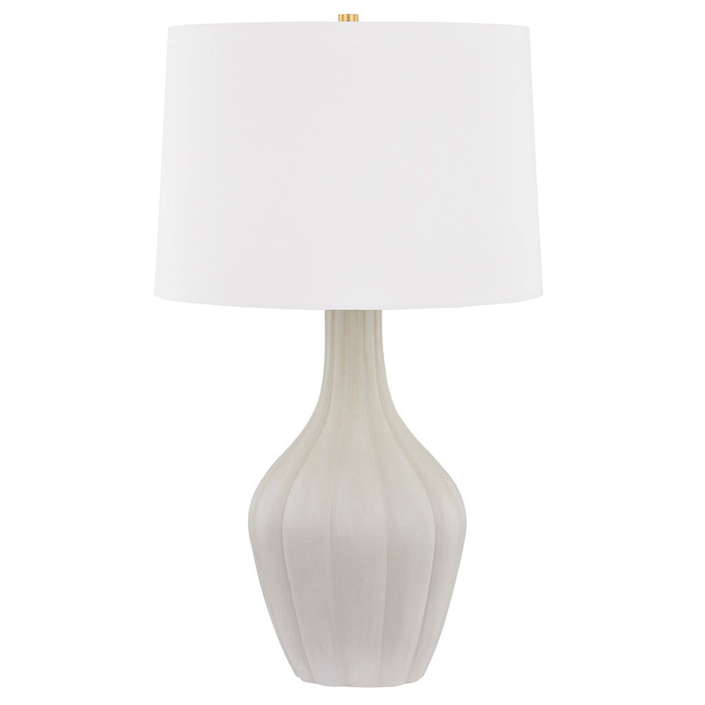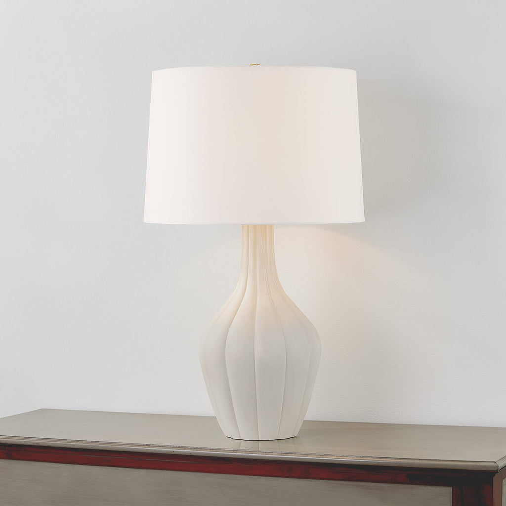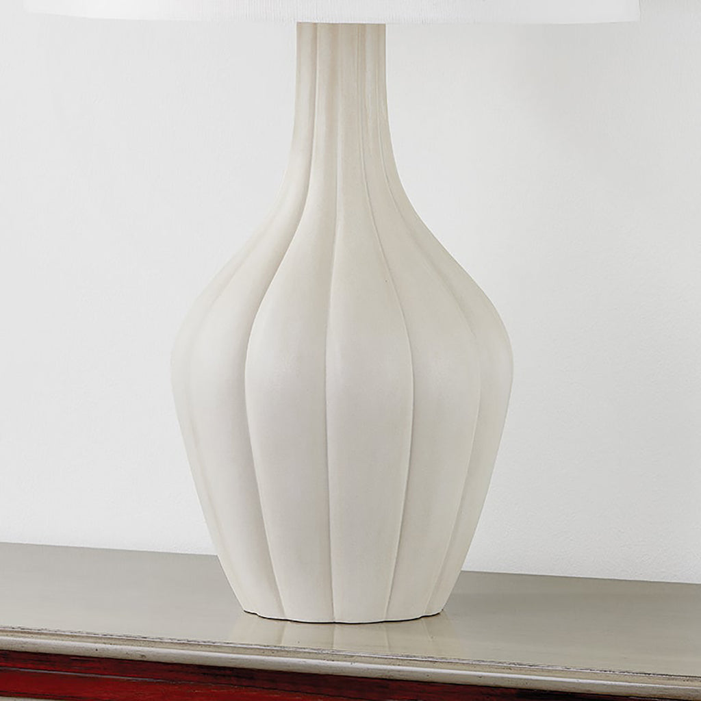 Bringing Scandinavian simplicity to any space, the Hudson Valley Lighting Glendora table lamp has inviting, fresh-from-the-kiln appeal. The ridged, gourd-shaped base is finished in a speckled white 'Misty Morning' glaze that evokes a handcrafted feel. A linen drum shade echoes the elongated straight neck of the vase-like silhouette while the ridges widen and narrow in harmony with the base's contours.