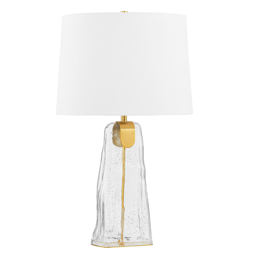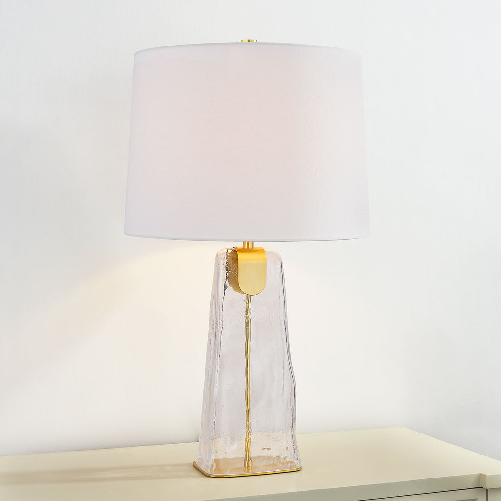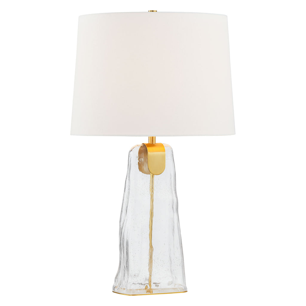 Renowned for built-to-last quality with a timeless feel, Hudson Valley offers a modern lighting collection with elegant touches, recalling vintage inspiration. Resembling ice, the clear bubble glass structure of this table lamp presents a glacial vision of modern design. The crisp white linen shade and Aged Brass frame balance the fixture with a sense of warmth. As a finishing touch, a discreet black twisted cord blends seamlessly with modern surroundings.