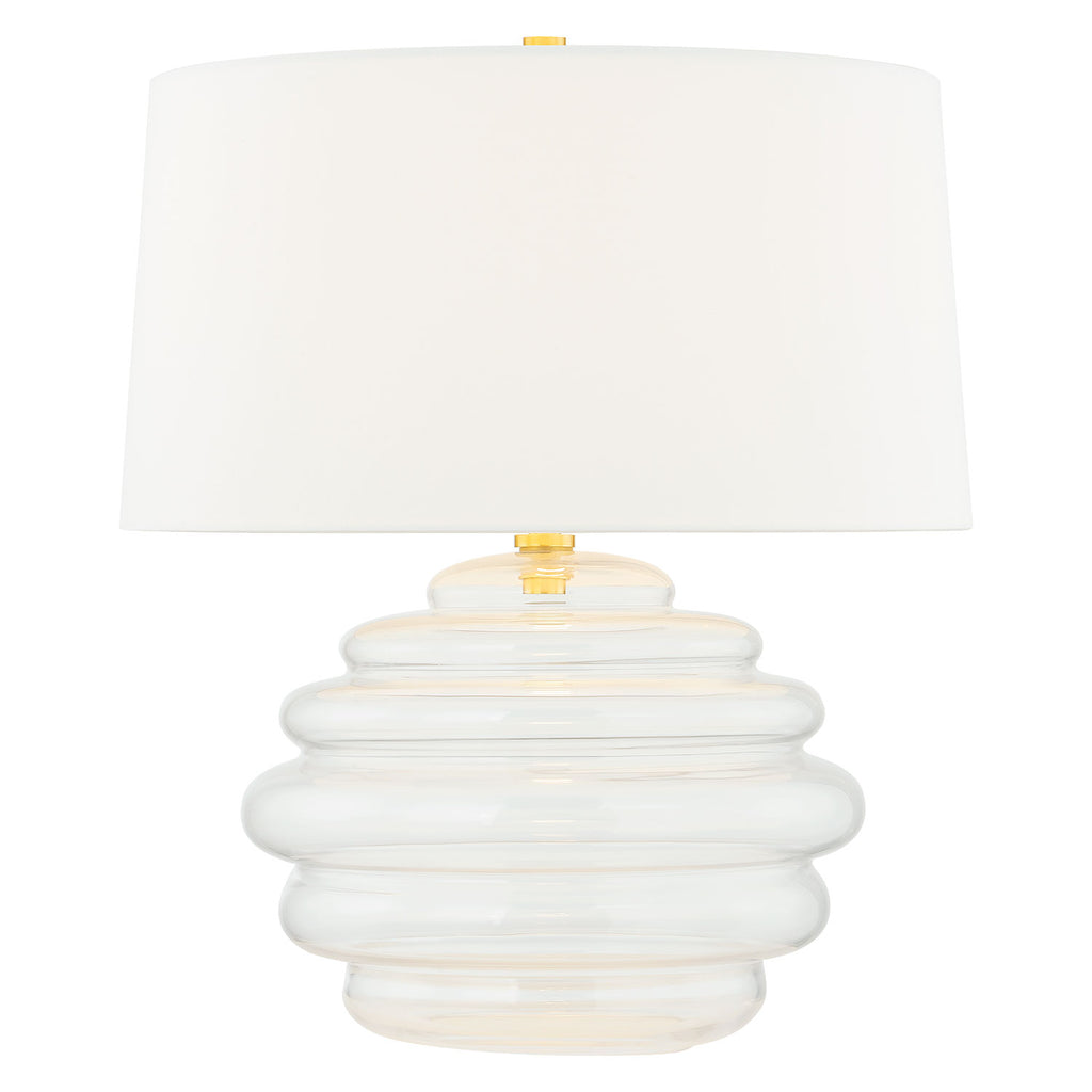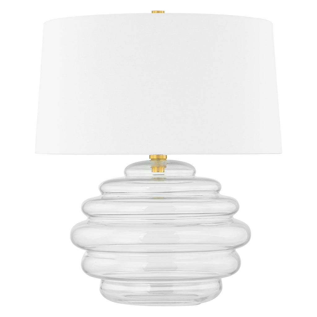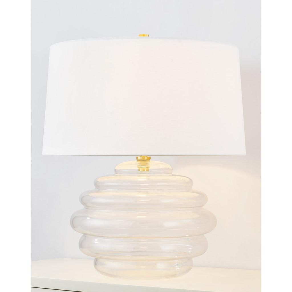 Renowned for built-to-last quality with a timeless feel, Hudson Valley offers a modern lighting collection with elegant touches, recalling vintage inspiration. A poetic interpretation of a bubble, Oshawa is light as air with a minimal, yet impactful presence. Made from clear glass, this artful table lamp is complemented by a subdued and calming white linen shade. The Aged Brass frame, visible at the neck, adds a metallic glimmer.