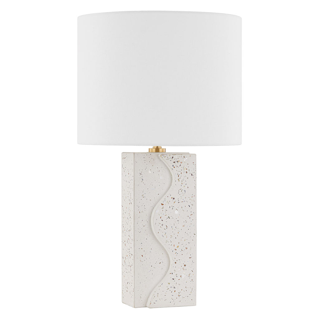High-quality and exceedingly creative, Mitzi delivers a semi-nostalgic classic lighting collection with streamlined contemporary elements that instantly upgrade your space. Waves own the moment, taking shape in the Mitzi Cort Table Lamp. Armed with artful flair, Cort features a terrazzo ceramic base with undulating curves and aged brass hardware. Topped with a white linen shade.