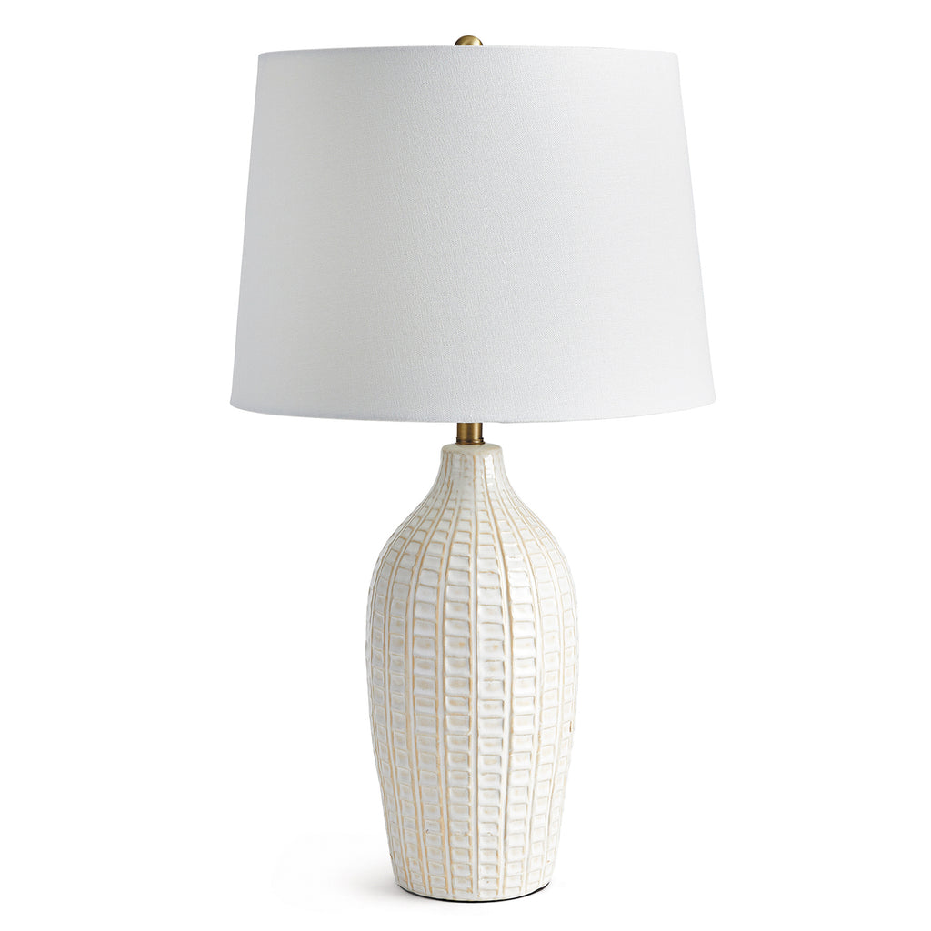 With a pressed pattern on the ceramic body, the Nadia Lamp is a work of art. Topped off with a generously scaled fabric shade, it is sure to enhance any space.