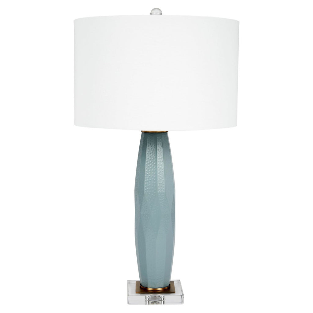 The focus of Old World Design is to fill the void in the lighting and home accessory market with high design and high-quality products. Each exclusive finish is hand applied to produce a high-end look with exceptional value. Modern blue glass simmons table lamp with brass accents and white linen shade.