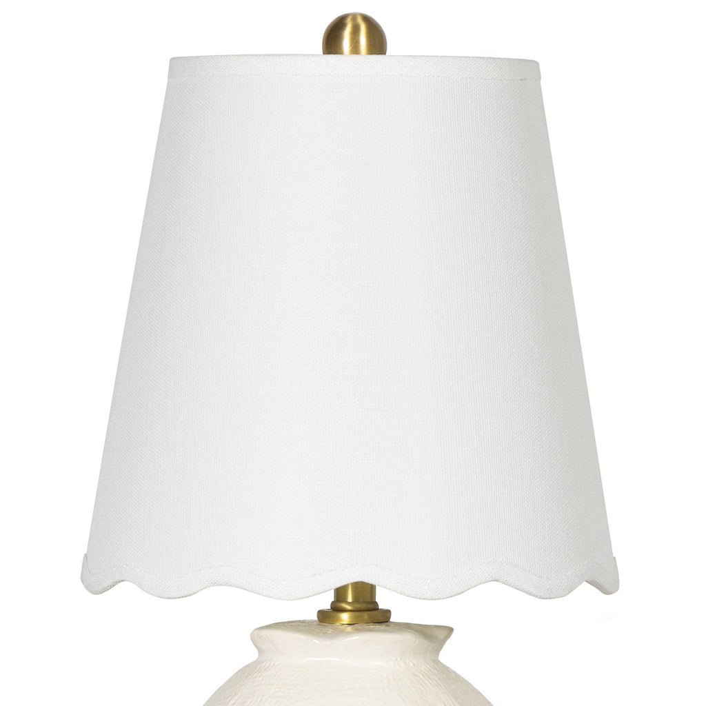 Introducing the Amoria Mini Lamp – a petite delight that brings a touch of whimsy to any space. Its wavy scallop-like shade adds a playful charm, while the white ceramic body and natural brass hardware exude a timeless elegance. Compact yet captivating, the Amoria Mini Lamp is the perfect accent piece to infuse your space with femininity and flair.