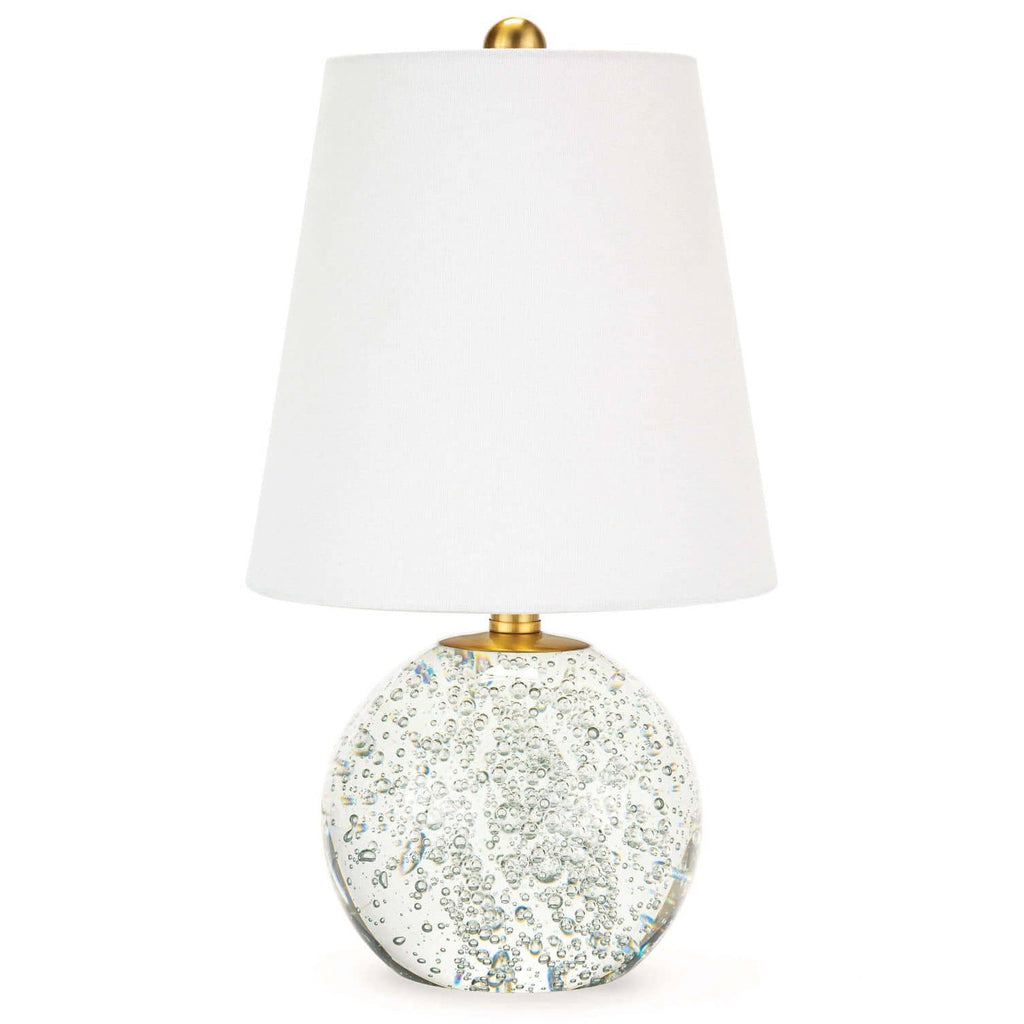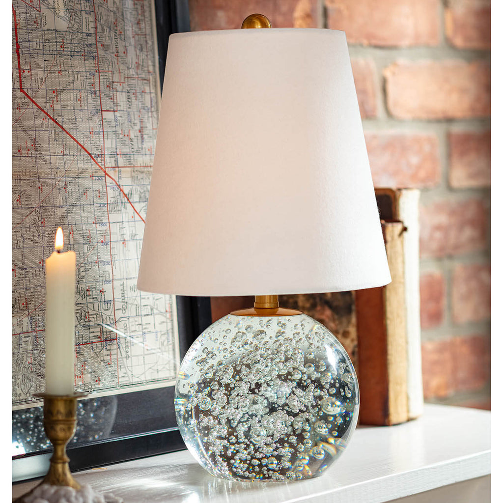 A classic spherical silhouette and crystal body has an alluring surprise element. Organic bubbles are suspended within the clear crystal body of the Regina Andrew Bulle Mini table lamp. Simple, elegant detailing completes the piece in the form of a natural brass neck and ball finial that sits atop a crisp, tapered natural linen shade. The Bulle is the perfect lamp for a bedside table, small end table or to give illumination to a shelf or display.