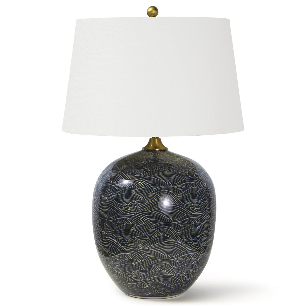 Ride the wave with this Japanese inspired Regina Andrew ceramic black-and-white table lamp. Its crisp white shade and antique brass hardware perfectly accent the delicately detailed art work. Place this lamp in a living room or bedroom and admire its beauty.