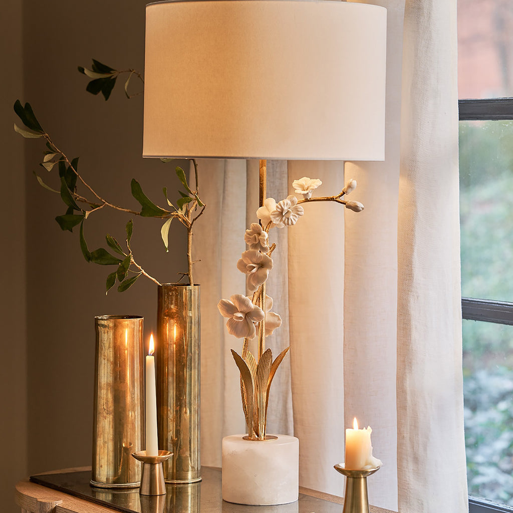 Experience timeless elegance with the Thylane Buffet Lamp, where eternal beauty meets exquisite craftsmanship. Resting upon a solid alabaster base, the lamp features a body inspired by an orchid in full bloom. Delicate porcelain blossoms and buds, along with stamped metal leaves finished in gold leaf, create a harmonious blend of grace and sophistication. The Thylane Buffet Lamp adds a touch of refined luxury to any space, capturing the essence of perennial beauty.