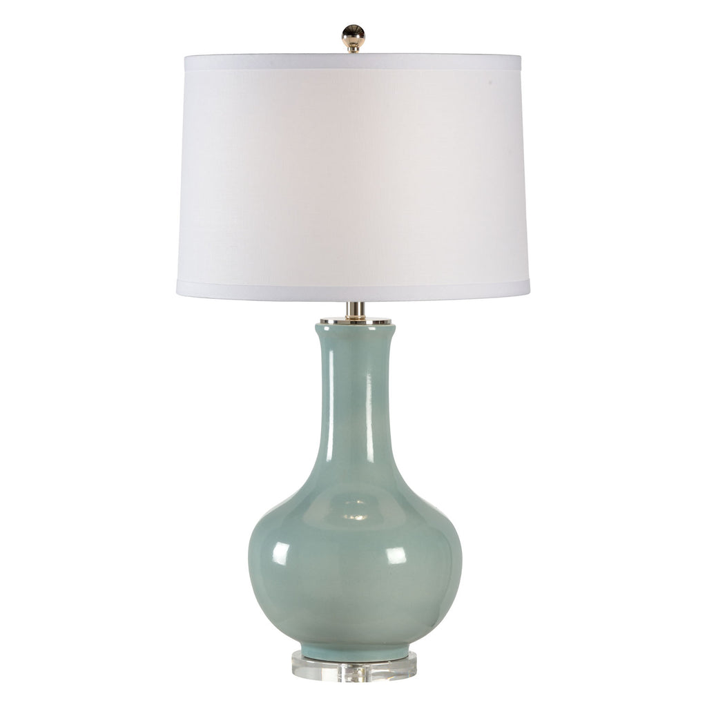 This Wildwood table lamp brings gorgeous illumination to your home. A beautiful accent for a living room or bedroom, this chic lighting fixture delights with timeless glamor. Ceramic with pale blue glaze acrylic mounting.