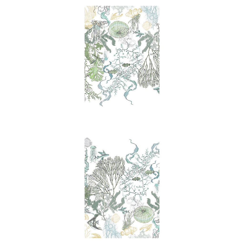 Tropical fish, coral, and seaweed drift elegantly in shades of white, green, blue, grey, and yellow on the Balade Marine Verde Table Runner by Garnier Thiebaut. Designed from hand-drawn artwork by Garnier Thiebaut's in-house artisans in France, this printed cotton-linen blend combines the softness of cotton with the strength of linen, creating a durable and effortlessly elegant addition to any table.