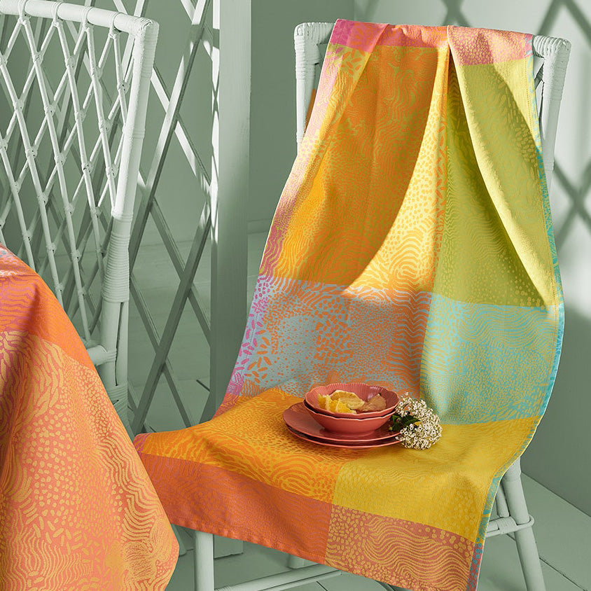 The Mille Vagues Exotique Cotton Tablecloth by Garnier Thiebaut features a stunning design with flowing waves of spots and lines in shades of yellow, orange, blue, and pink. Hand-drawn by our in-house French artisans and jacquard-woven with extra-long staple cotton, it brings elegance and durability to your table.