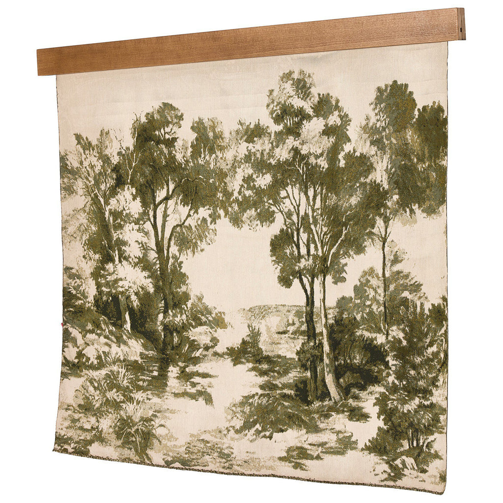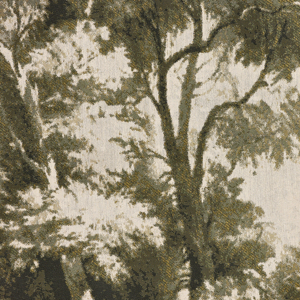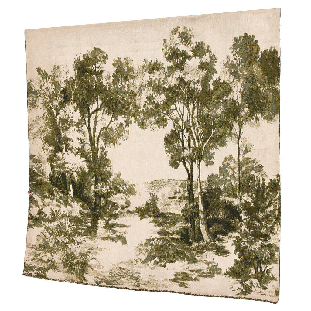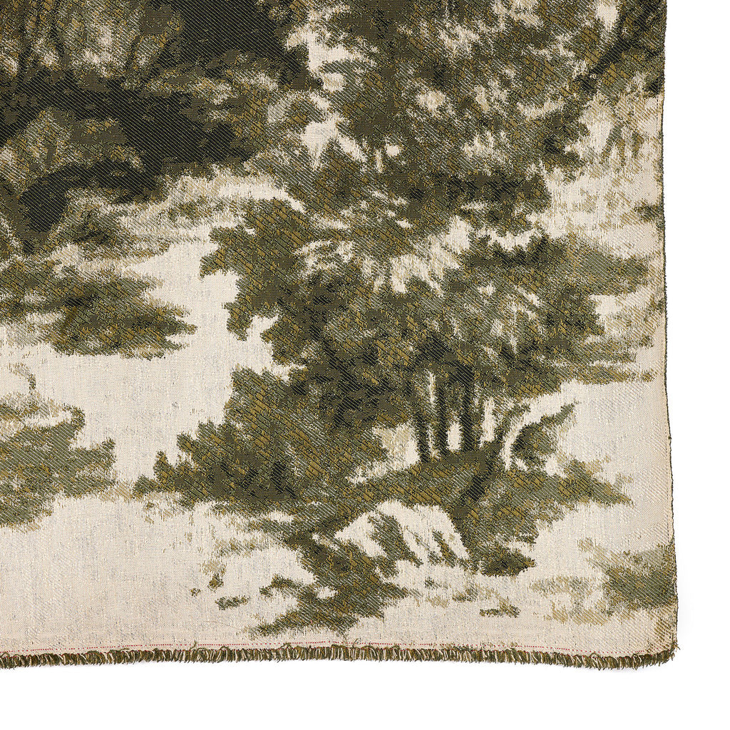 Inspired by vintage toile wallpapers, an updated textile weave illustrates a rich olive green landscape on a warm ivory background, with fringe on the top and bottom.