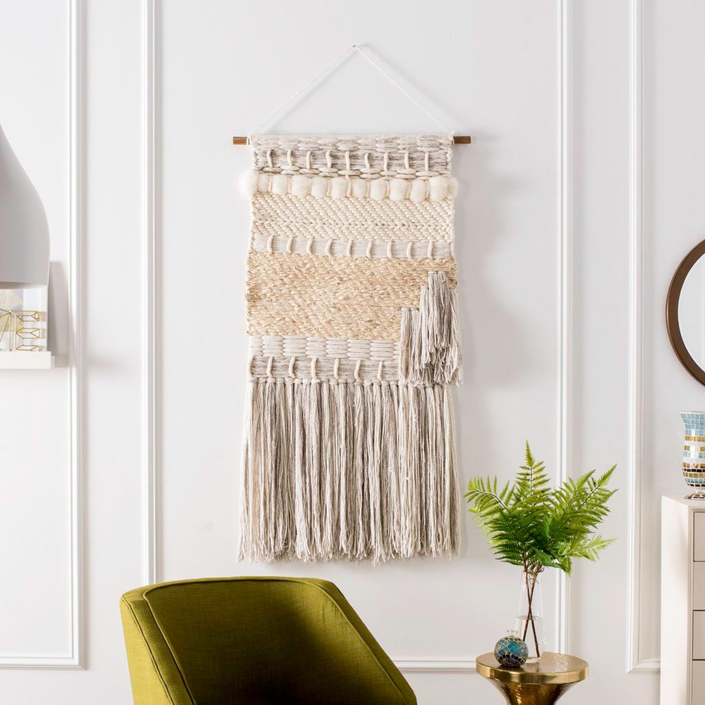 A stunning display of artistry, this contemporary woven wall art adds a sculptural touch to any living room. Constructed with wool and cotton, its dynamic texture is highlighted by its oversized fringe details. Cream hues add a soft touch.