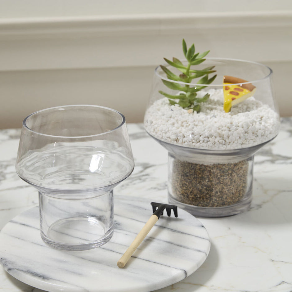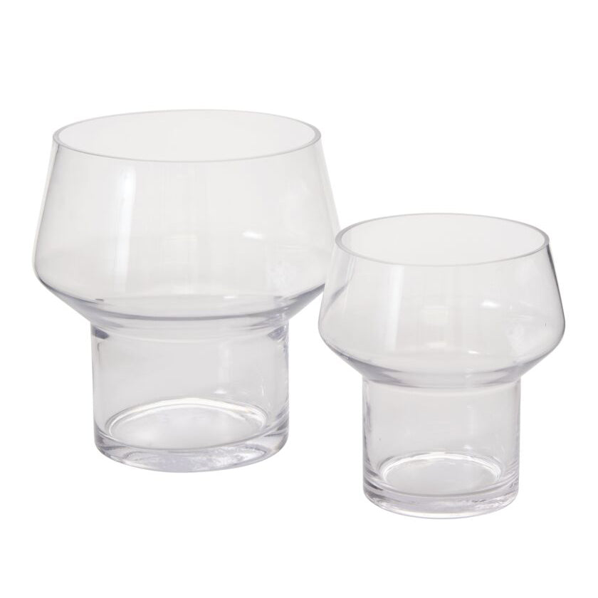 Plant the terrarium garden of your dreams in the small Fiction Terrarium, a footed, clear glass vessel with a wide opening and lots of room for growth. The deep cylinder shaped foot can be layered with pebbles, sand, or other filler, creating a plush base for small drop in plants to root and spread out. Available in two sizes, the Fiction Terrarium is a must have offering for DIY terrarium bars and plant shops.