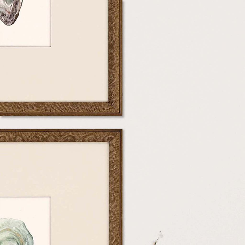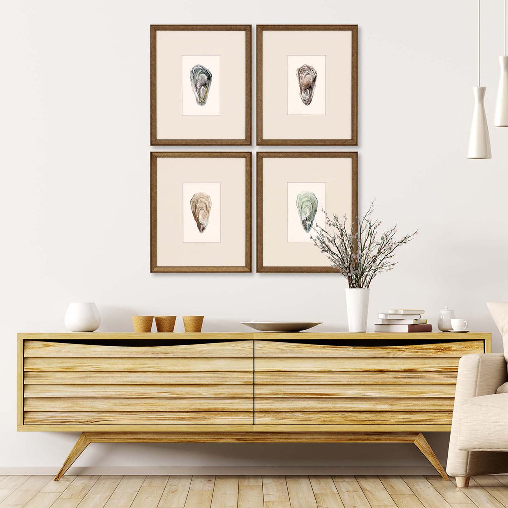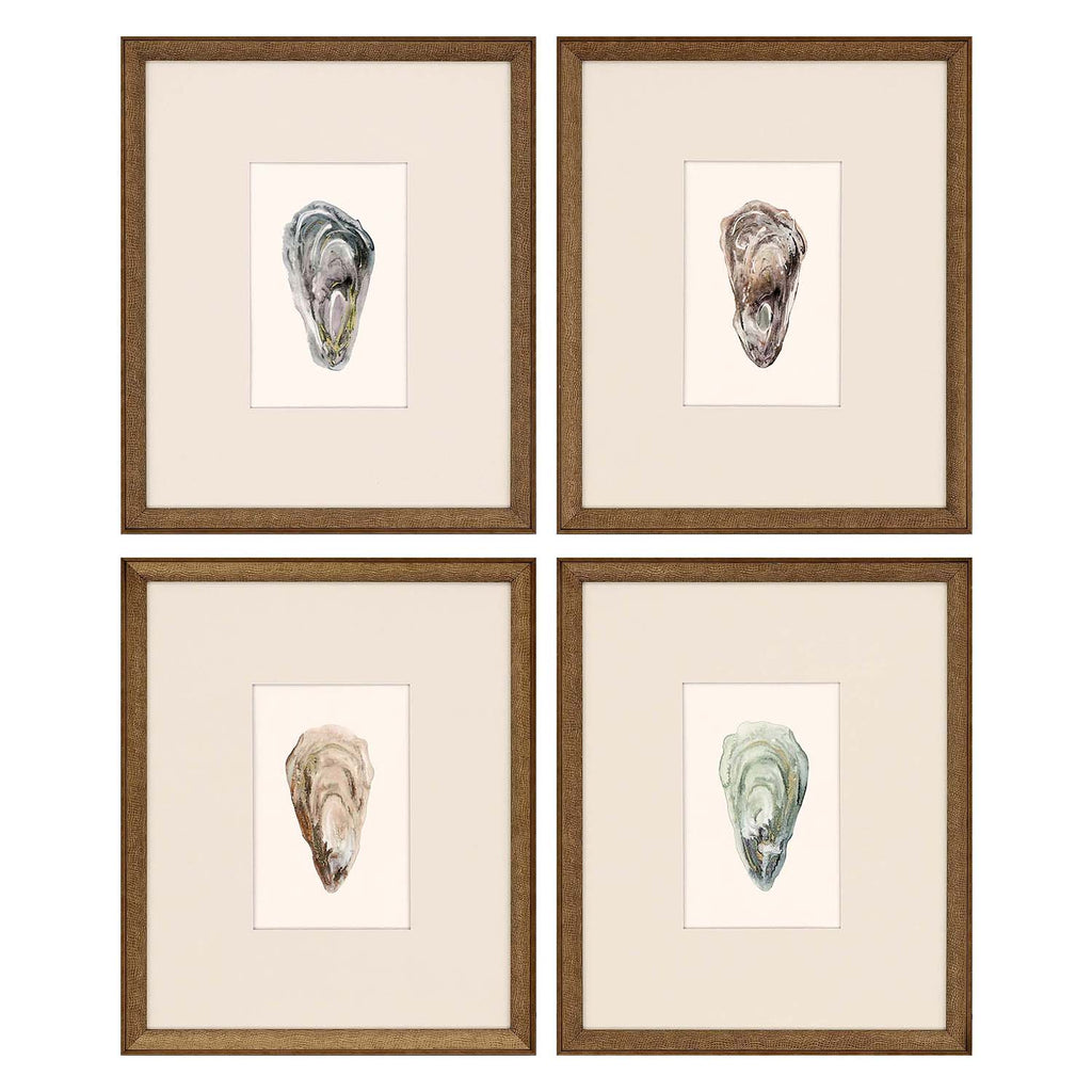 Oyster studies are matted in white. Framed in an antique gold wood molding with embossed weave pattern. Sold as set of four.
