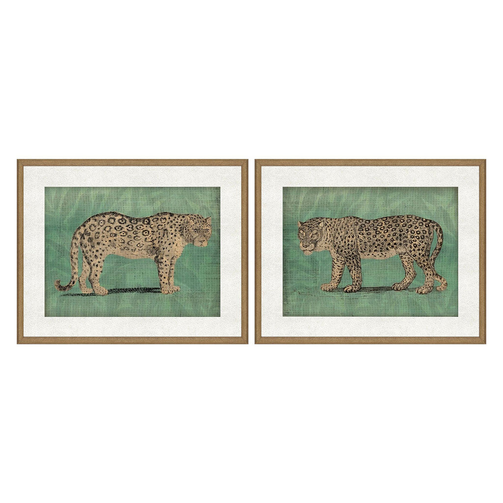 Jungle cats sport an updated backdrop for a modern feel. Featuring premium matting and framed in an antique gold wood with embossed weave pattern.