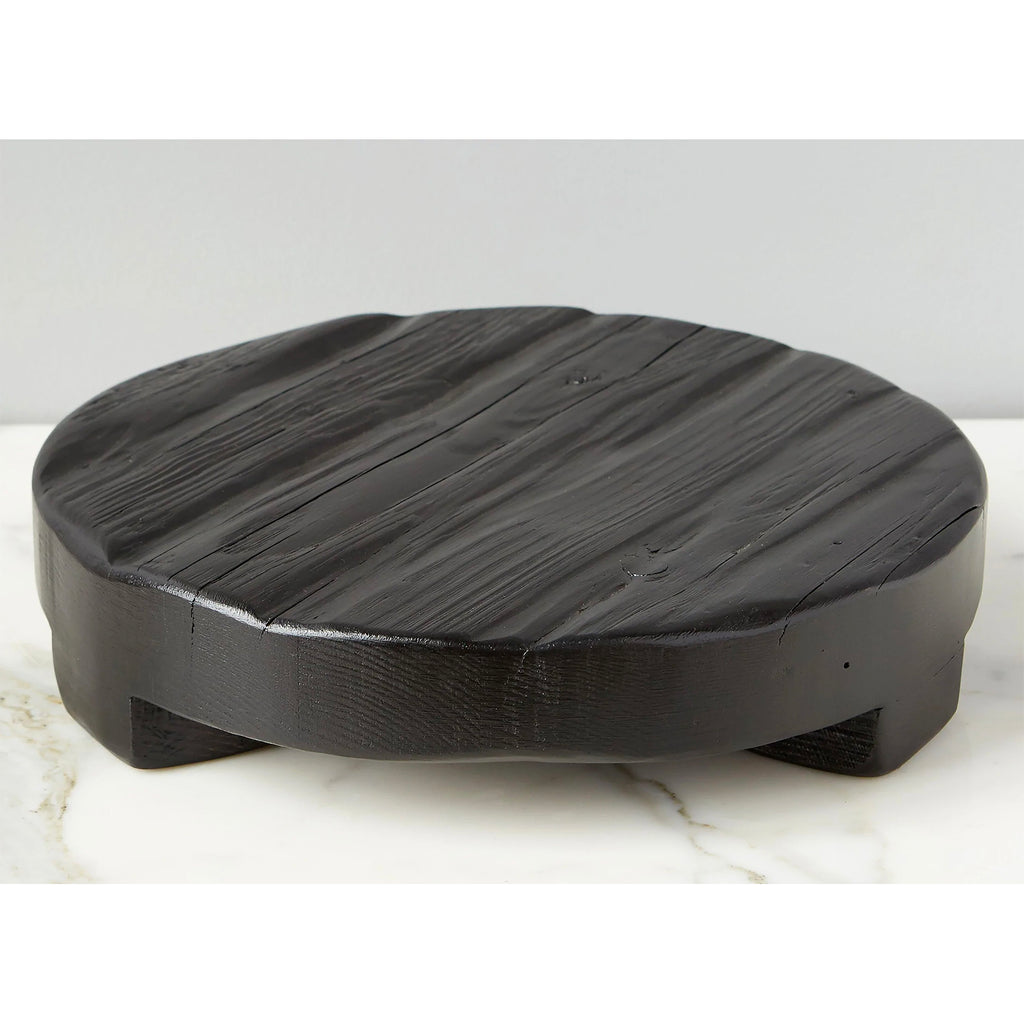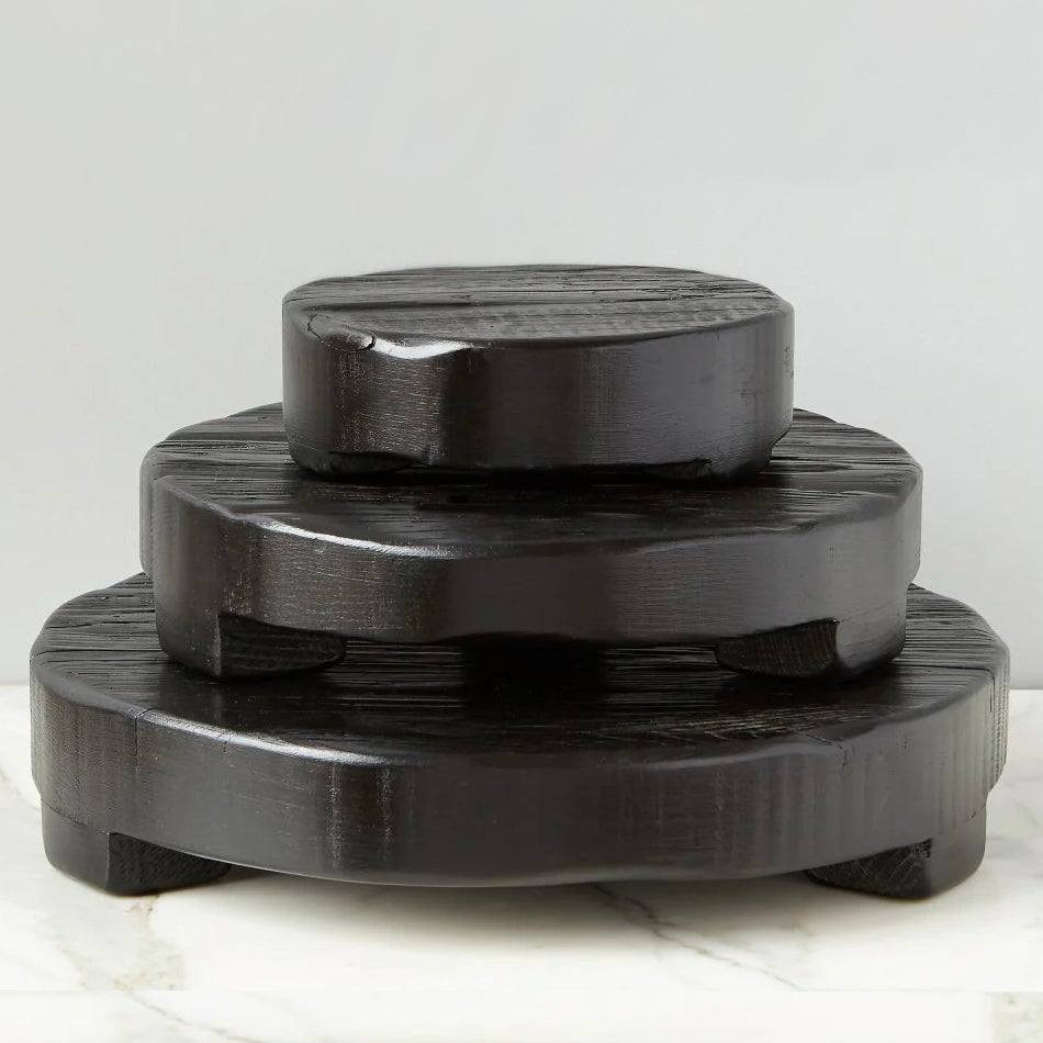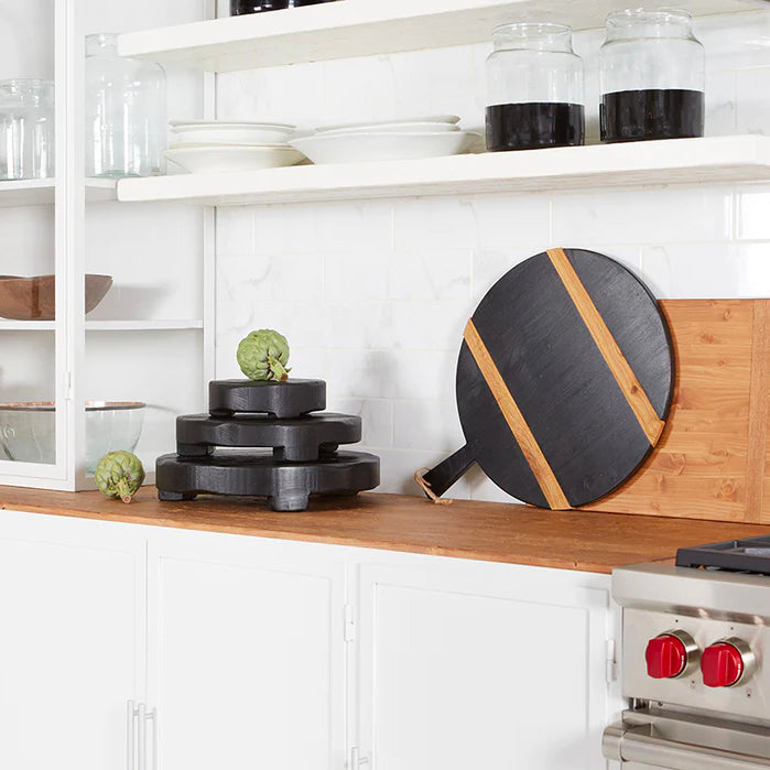 Handcrafted from reclaimed wood, the round wooden trivet, is a must-have decorative accent for any table top. The round wooden board’s black coloring is just a bonus, the riser can also be utilized as a hot pad and can be paired with hot or cold dishes straight from the oven or fridge. Indulge in a trivet set by mixing and matching shapes or sizes to make a true statement in any kitchen. This decorative piece is hand-crafted from reclaimed wood. Due to the nature of the found beams, no piece will be perfectly identical and will contain varying crevices and splits within the wood, embracing its organic beauty even further. etúHOME’s serving boards are intended for serving only and should not be used for cutting or chopping. To protect and preserve the integrity and longevity of the piece, we recommend using a barrier such as parchment paper, a plate or a bowl for non-dry and hot ingredients.