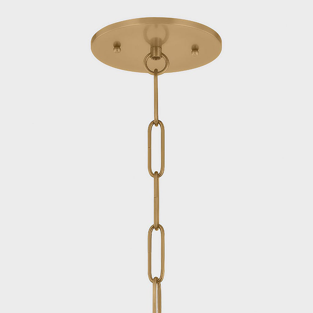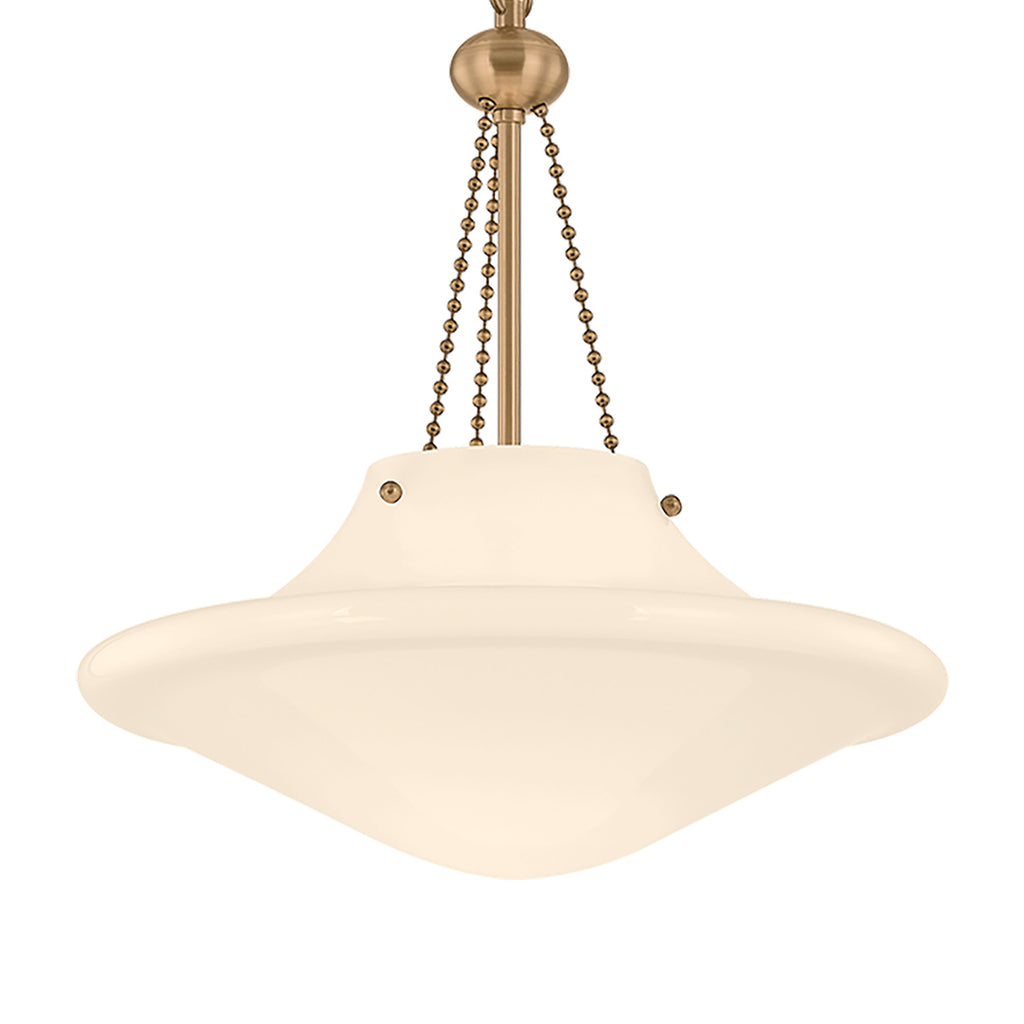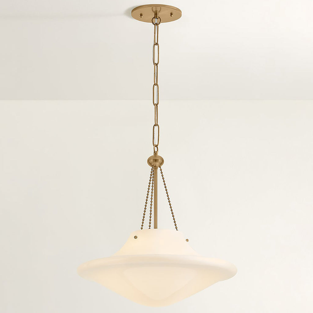 An ethereal pendant-lantern hybrid, Lauren Liess x Troy Lighting Era combines a sleek opal glass shade with charming vintage details to create a soft yet striking focal point. The large shade emits a warm, ambient glow—ideal for gathering spaces like dining rooms and kitchens. Decorative rivets and a retro ball chain in Patina Brass add a touch of vintage glamour. Available in two sizes, Era brings timeless style with a hint of mid-century cool.