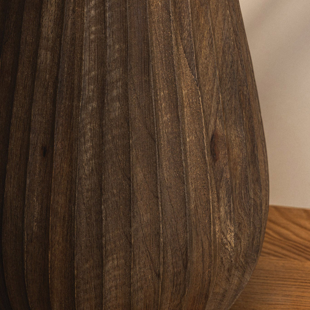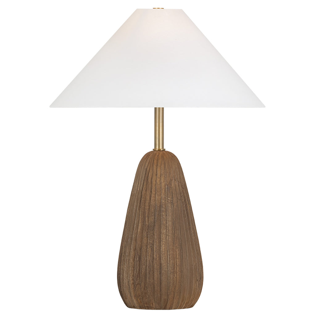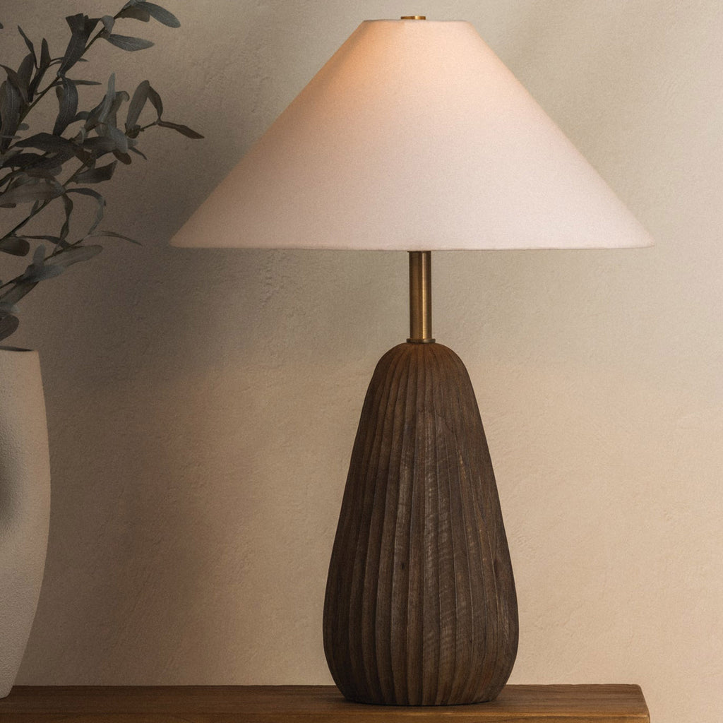 With its hand-carved base and warm stained wood, Heartwood is a sculptural study in texture and authentic charm. Rustic grooves add depth and character, while an ivory linen shade softens the silhouette. A Patina Brass neck lends a hint of polish to this grounded, one-of-a-kind design.