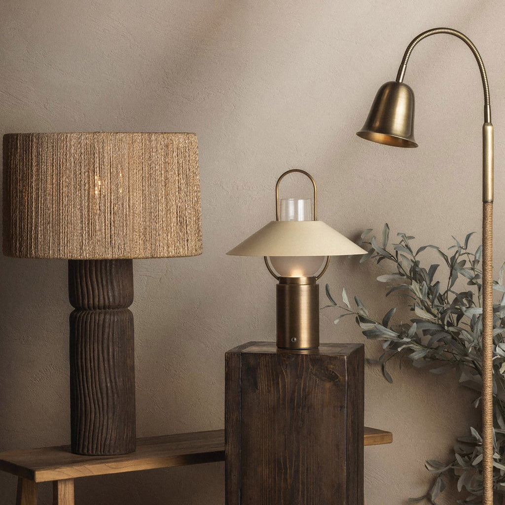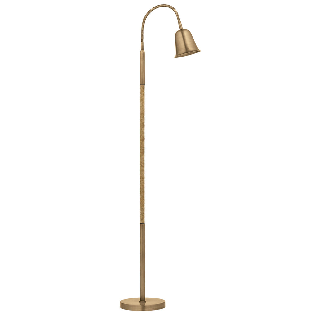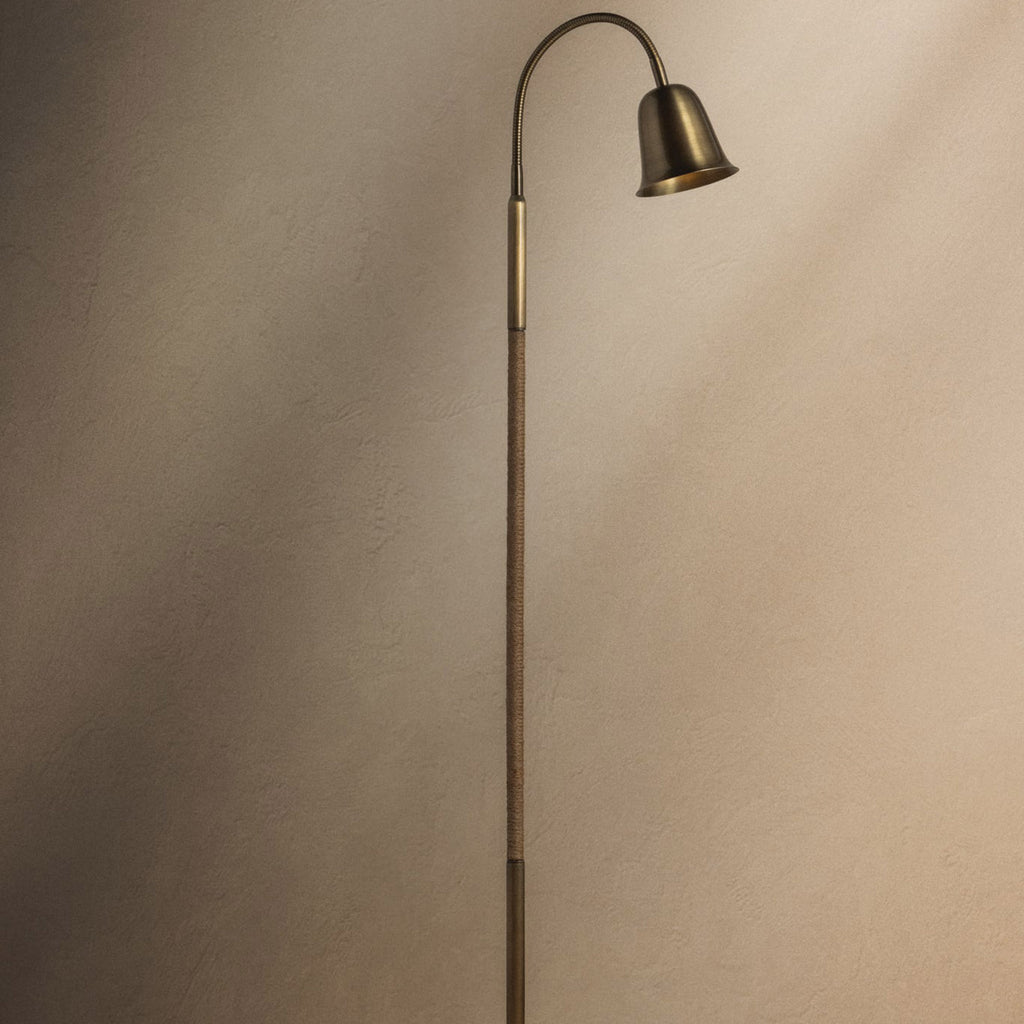 With playful proportions, a tactile material mix, Lauren Liess x Troy Lighting Wharf balances functions and personality. The long, curving gooseneck is adjustable in any direction to create the perfect reading light, while the petite bell-shaped shade houses an MR16 bulb for precise illumination. Finished in Patina Brass, the metal base is partially wrapped in jute cord, adding texture and a subtle coastal nod.