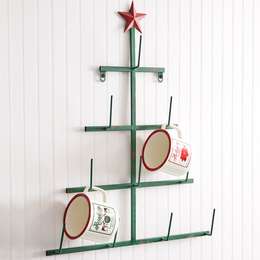 Display holiday mugs, wine bottles, or jewelry on this Christmas tree wall rack. Features nine arms for hanging product and two keyhole hangers to hang on the wall.