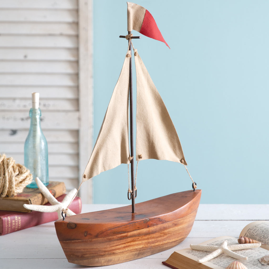 Nautical and charming, this Handcrafted Sailboat Sculpture is the perfect accent for a coastal or lake home. This handcrafted piece is fashioned from solid mango wood and features canvas sails. This item requires some assembly.
