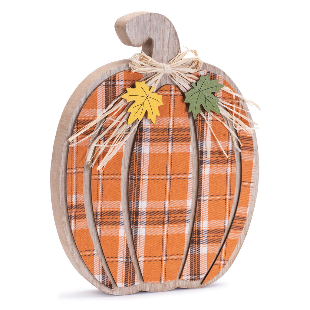 Get your home ready for the fall season with this beautiful set of Plaid Pumpkin Shelf Sitters. Featuring two assorted designs, this set is sure to add a modern yet traditional touch to your Thanksgiving Day decor. The rustic ornage and yellow tones paired with classic plaid pattern and leaf shapes with raffia bow accent is the perfect combination to create a stunning fall display. The quality solid wood composition is sure to last for seasons to come. Display the pieces on your mantle or bookshelf to add interest to your space, or gift them to a special someone in your life to spread the festivity.