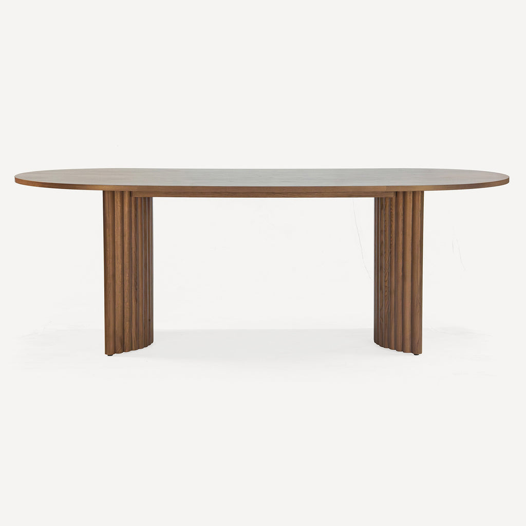 The Accord dining table features two fluted, semi-circular pedestal bases crafted from solid, FSC certified Oak. The veneered tabletop, with half round endcaps, is finished in a subtle, smoked Oak stain to accentuate the natural graining of the wood.