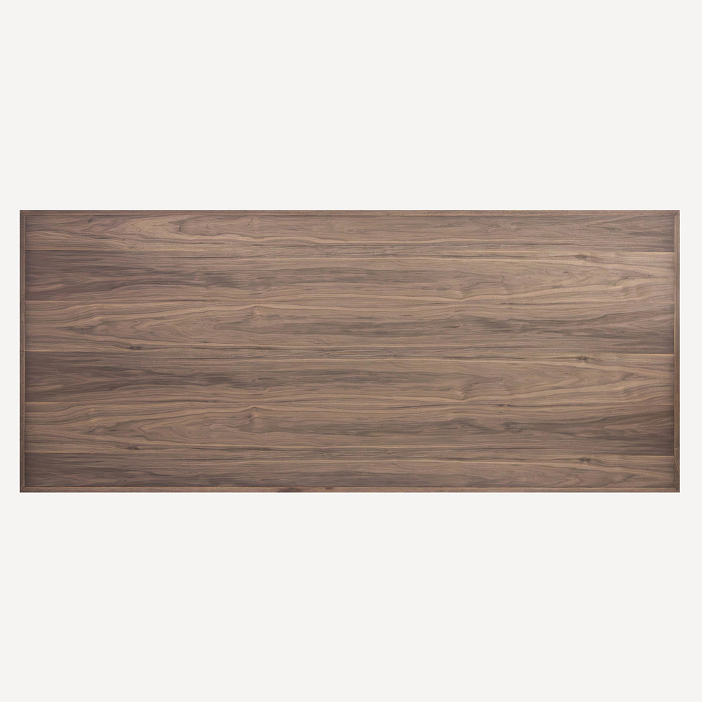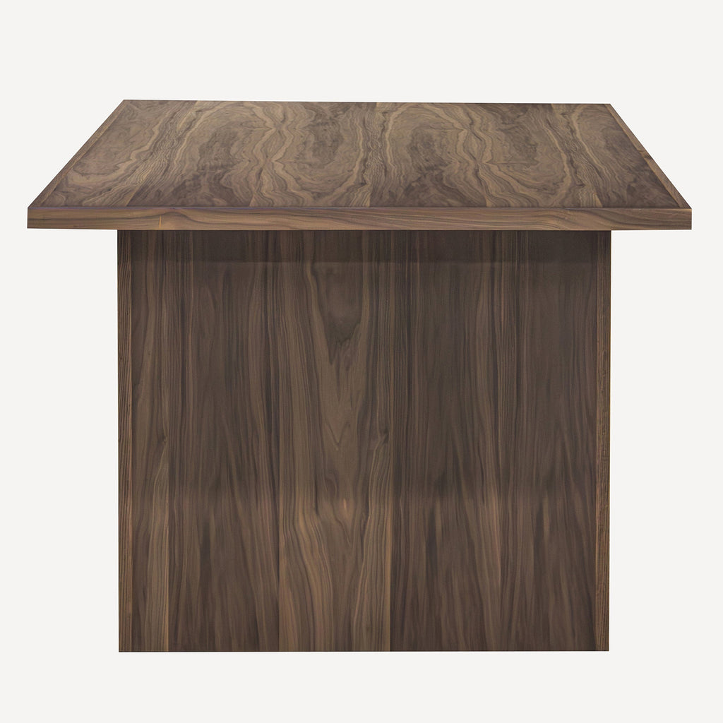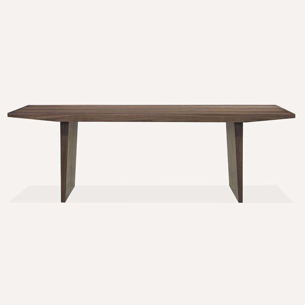 Featuring a solid wood face frame, the geometrically inspired Tangent dining table makes a bold statement in any dining space. Veneered in walnut and finished in a matte, water-based finish, the tabletop is supported by two dynamic, angular pedestal bases.
