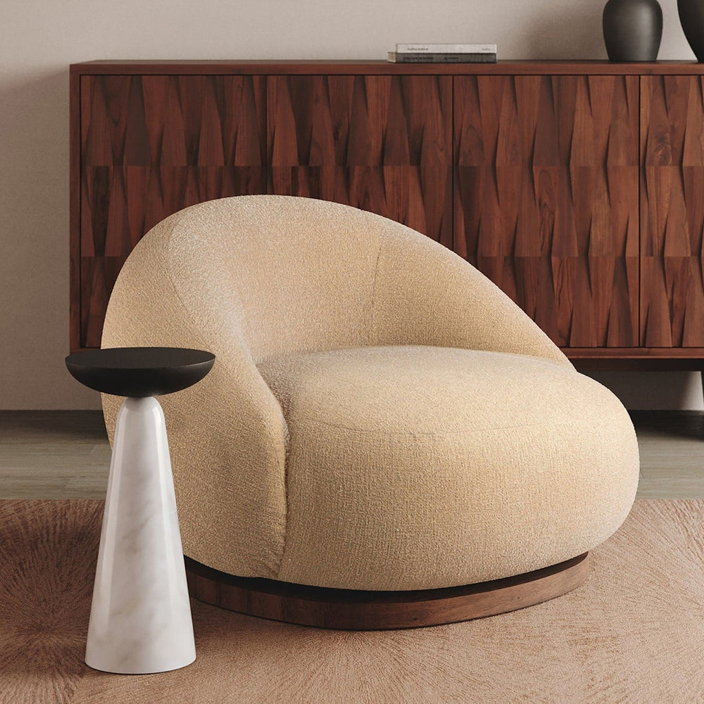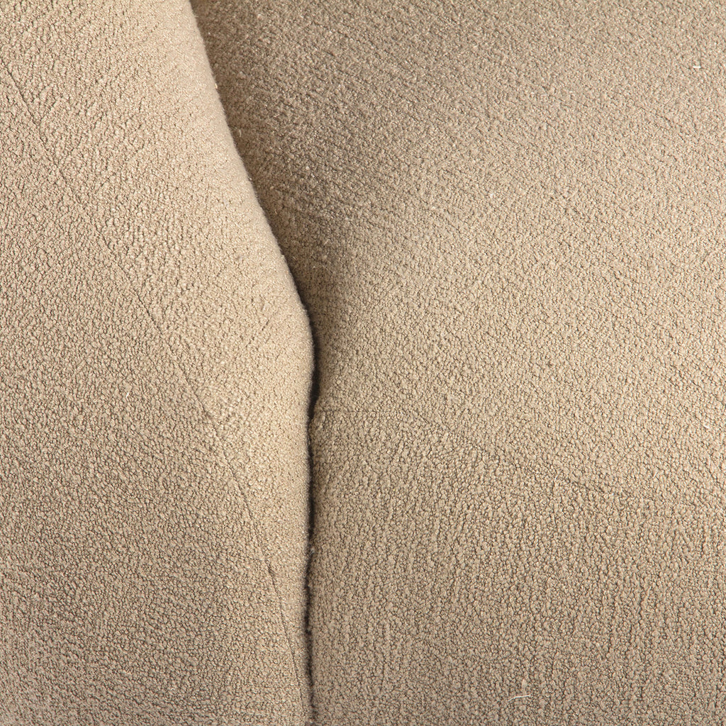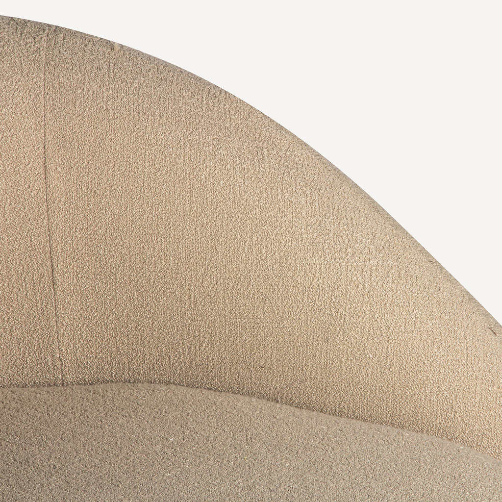 The June lounge is an oasis of comfort with its soft curves and inviting silhouette. Upholstered in plush textured boucle and supported by a solid wood base with a 360º swivel, it provides the perfect place to relax and unwind.