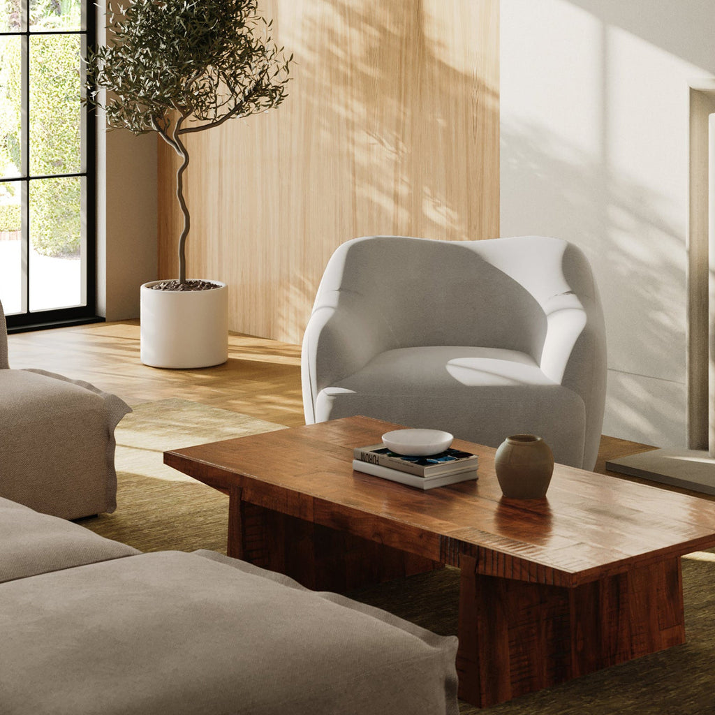 The Keystone collection features bold, angular forms with oversized, exposed dovetail joints. Crafted from laminated, solid reclaimed wood cut offs, each unique piece is finished in a water based, light walnut finish to highlight the grain and texture of the wood grain.