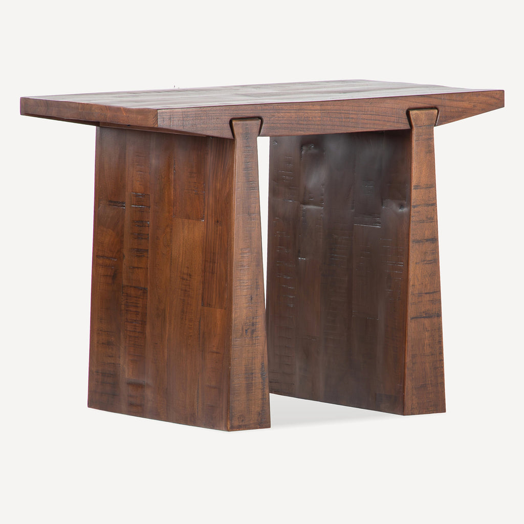 The Keystone collection features bold, angular forms with oversized, exposed dovetail joints. Crafted from laminated, solid reclaimed wood cut offs, each unique piece is finished in a water based, light walnut finish to highlight the grain and texture of the wood grain.