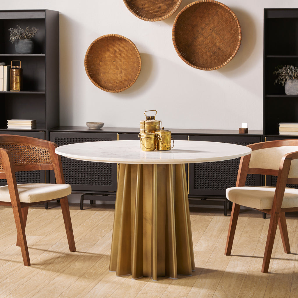 Distinct in style and always experimenting, Union Home Furniture adds expression to every room in the home with artfully crafted modern pieces. The Union Home Shorefront table features round shaped white Banswara marble fitted on a brass plated mild steel base, created to bring a spot of glam in any dining room.