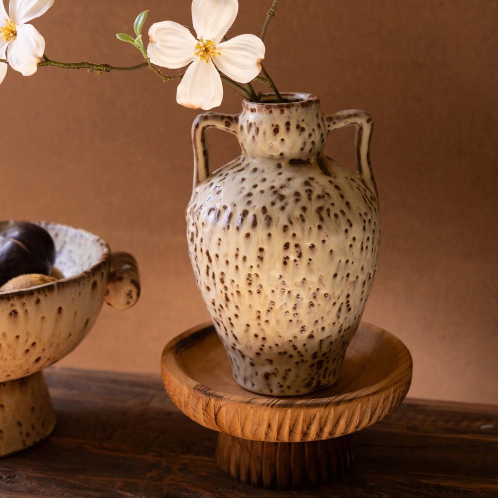 Add a classy touch to the hunting camp with this rustic urn with two handles. Fill it with fronds for an interesting centerpiece or use it in the office. The speckled appearance makes it a great fit anywhere you need a rustic touch.