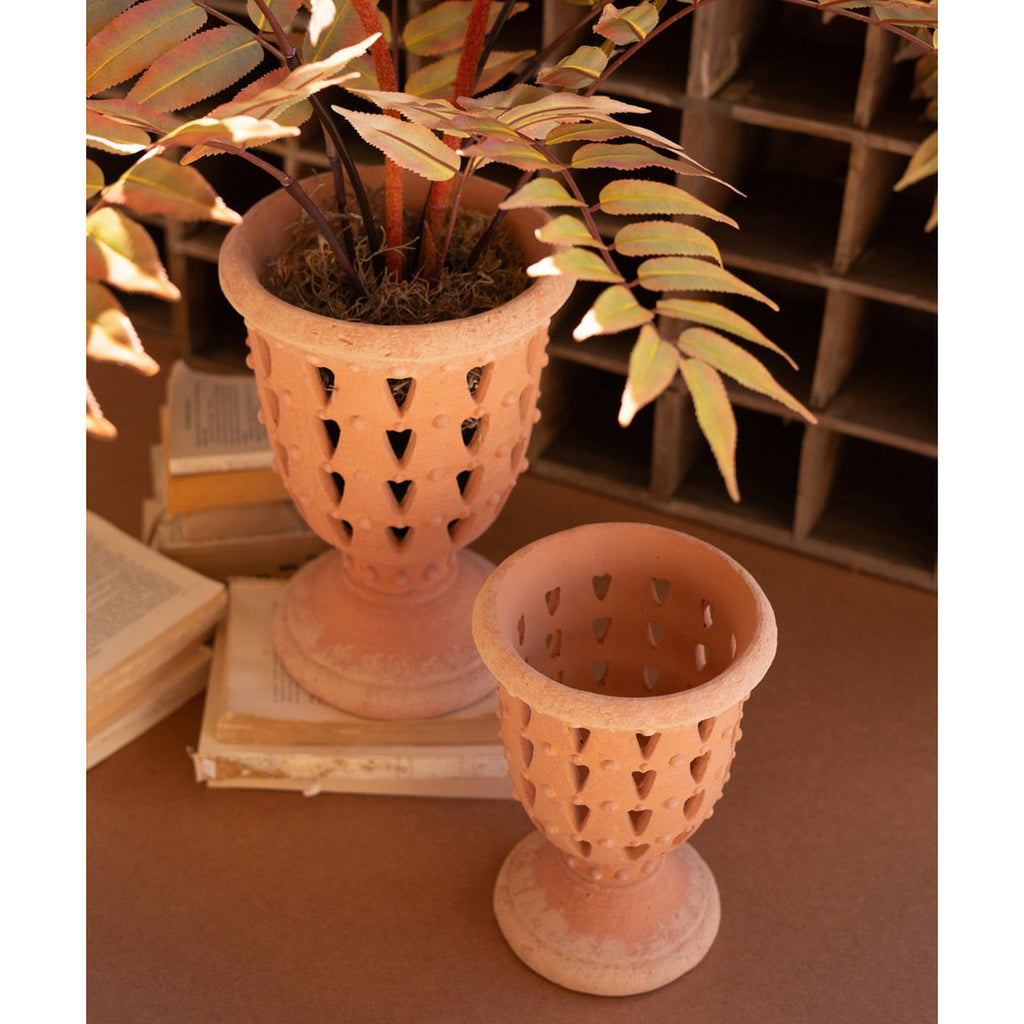 Don't worry about drainage! Place your favorite potted plant in this unique set. These two concrete perforated urns in terracotta suit a porch or sunroom.