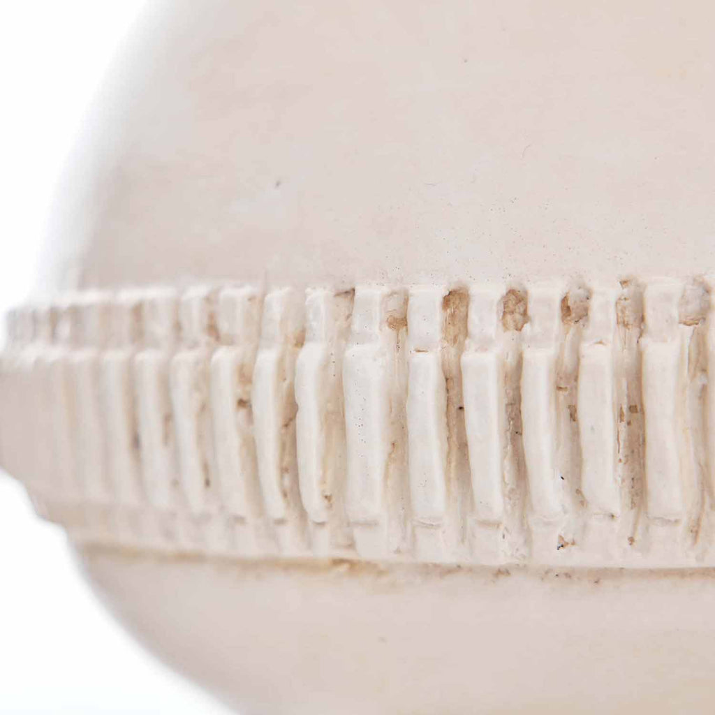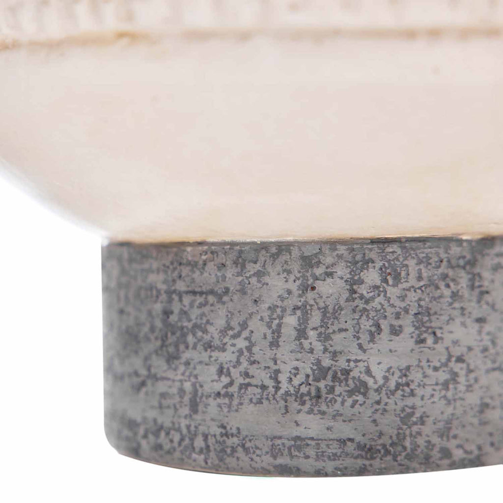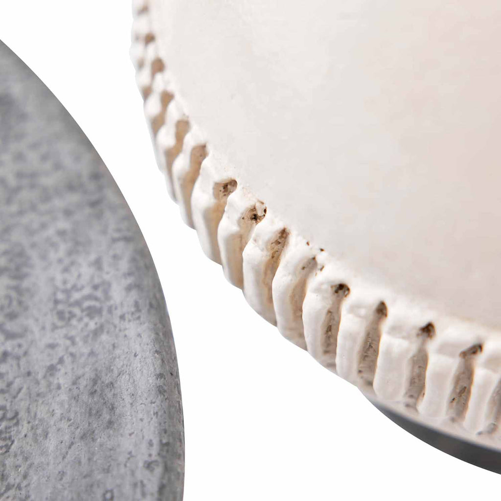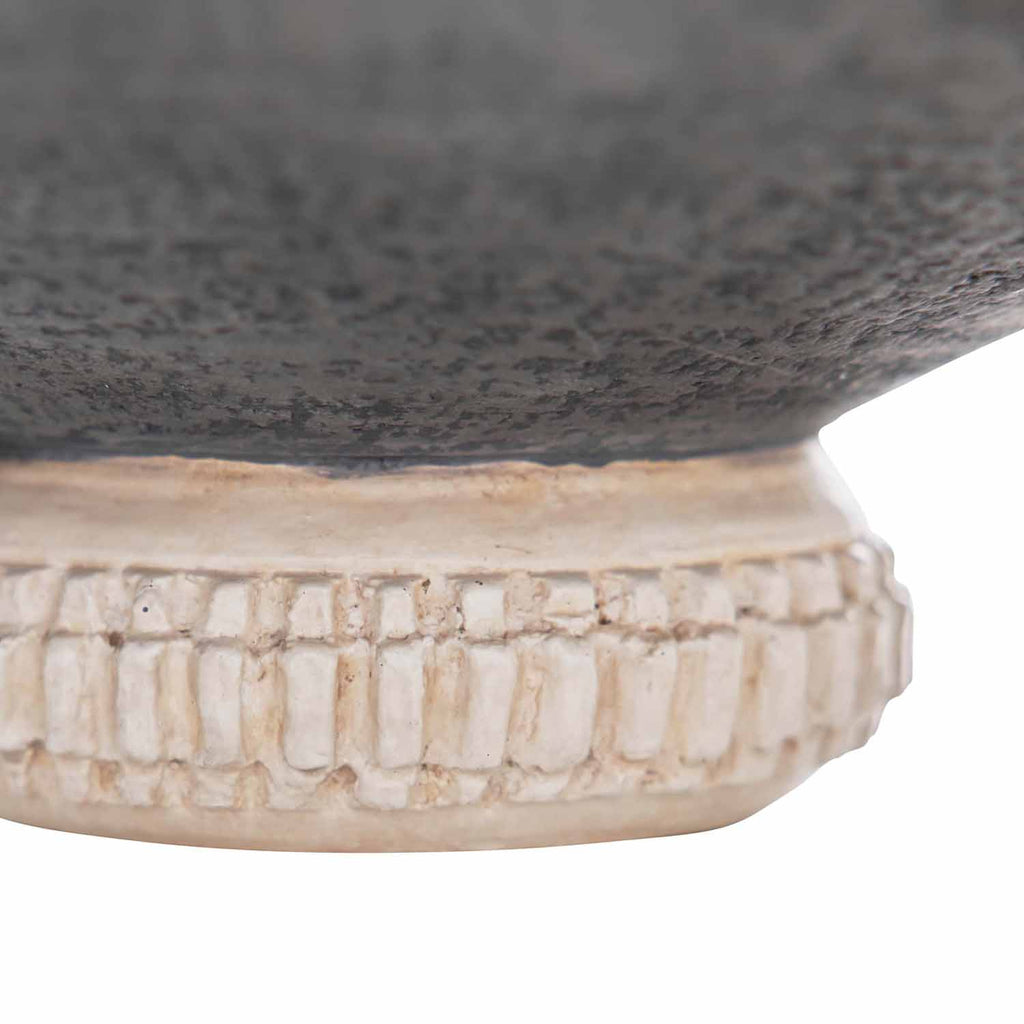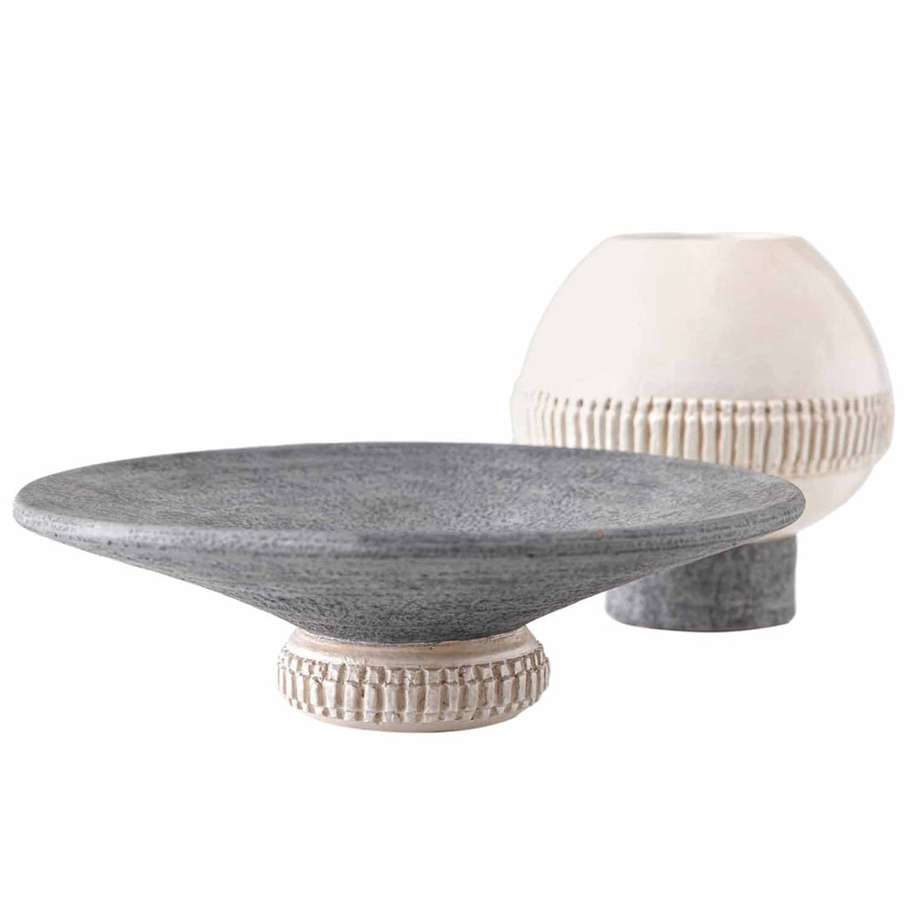 Our two-tone Arteriors Taza centerpiece and vase set bestows an artisanal character to any tabletop. The pair is designed in contrasting graphite and ivory terracotta with opposing matte and gloss finishes. Carved, textured bands, reminiscent of tramp art, decorate each piece. Finish will vary.