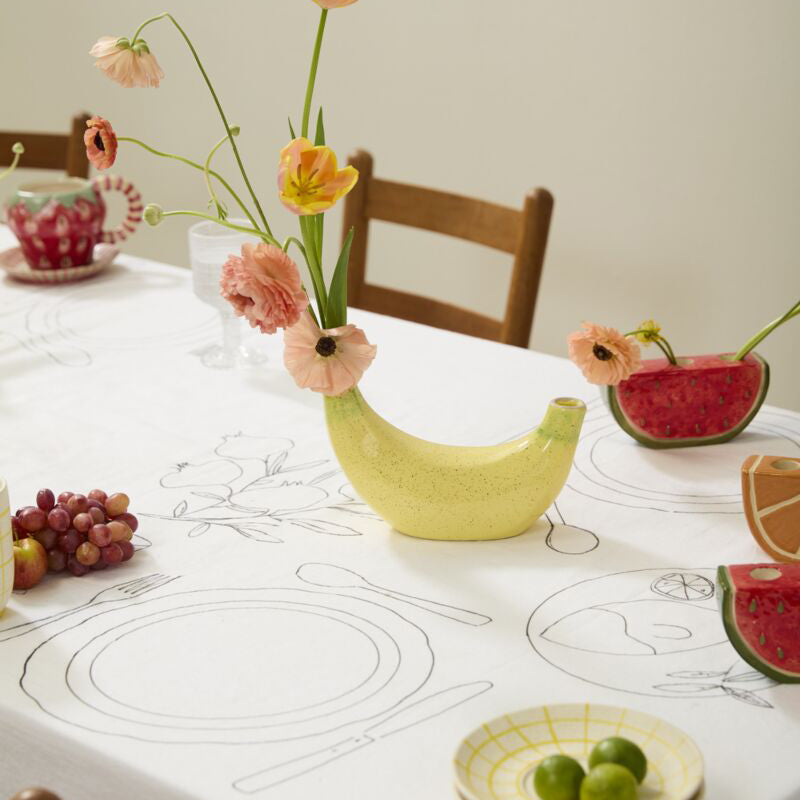 Fresh, fruity, & playful, the Banana Budvase is a delightful, colorful addition to a dining or kitchen table along with a few stems in each opening. This hand painted yellow banana features a speckled glaze with green ends at the vase openings. This quirky, trendy piece is both functional & decorative for the home & pairs nicely with our other fruit-forward tableware items for a coordinated, summery look.