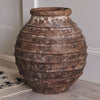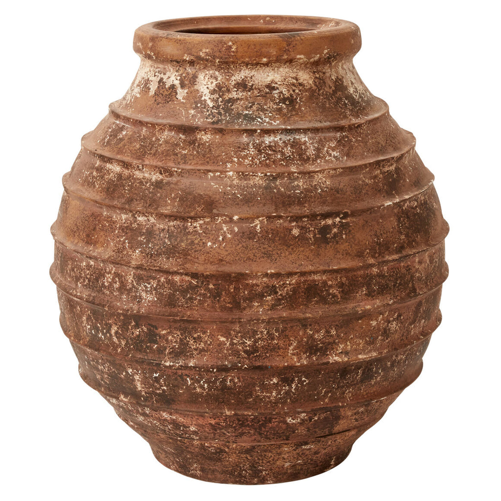 Fill a hallway, entryway, or dining room with nature, scale & a modernized, old-world look with the rustic orange beauty of the Bellamar Vase. Featuring a classic rounded shape with dimensional bands wrapped around the surface, this handmade terracotta, oversized sculptural vase stands tall on its own or styles beautifully with large branches, palms, dried hydrangeas & more.