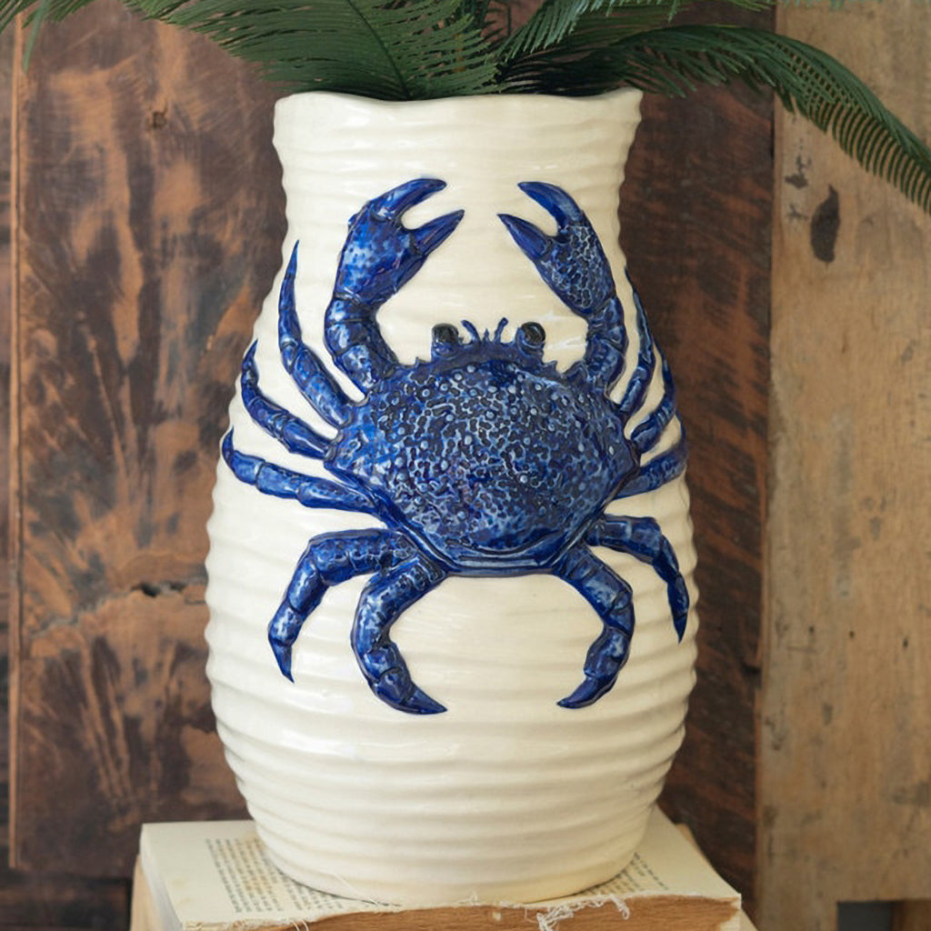 This neutral ceramic planter has a blue crab detail. For seaside shacks or themed kitchens that need a pop of color. Use it with the red lobster planter or alone.