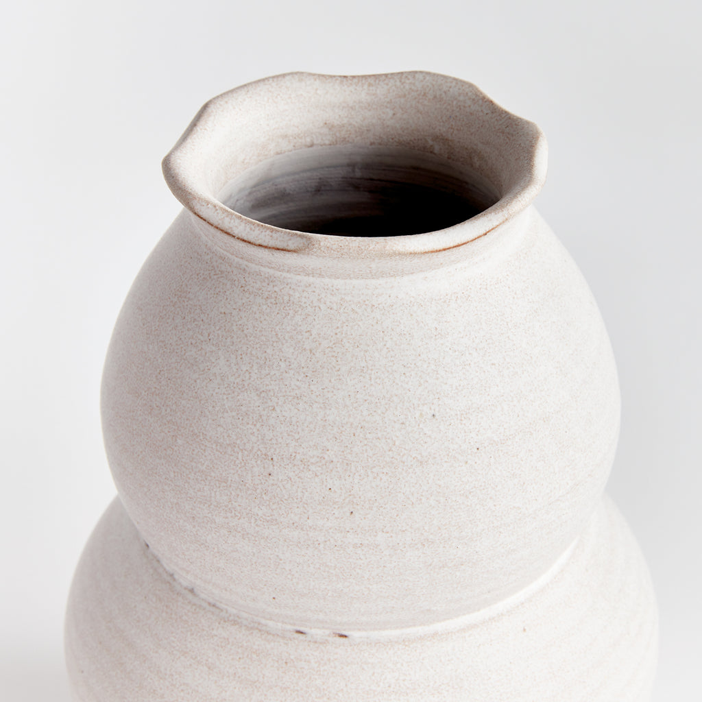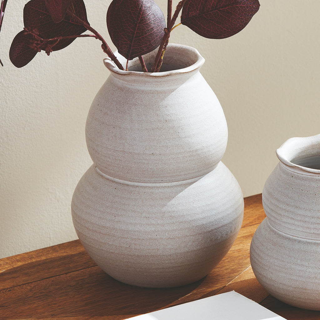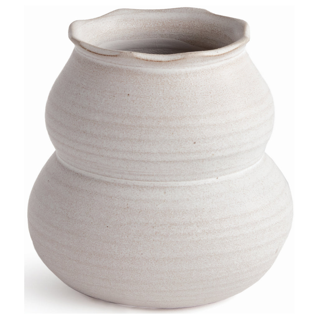 This hand-thrown vase has a weighty feel. Made with subtle ridges and a matte finish. The perfect little vase for a few faux stems. Tuck in a bookshelf or place on a windowsill to brighten the view.