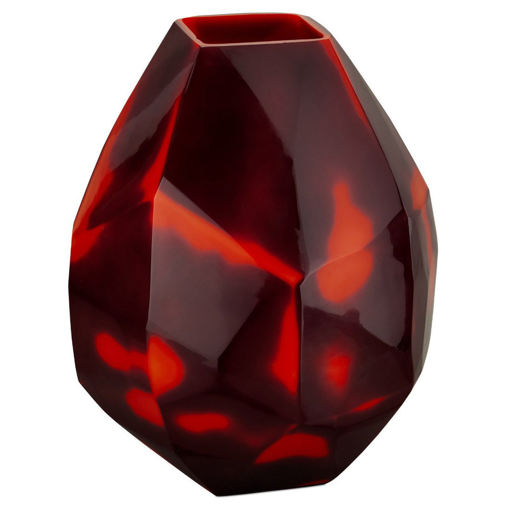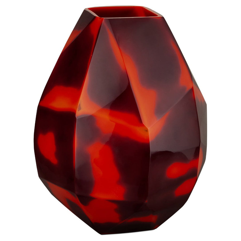 Like a cut diamond with a faceted form, the Akako Vase is a large mouth-blown glass vase with an angular profile. The vivid coral against the deeper color on its surface will make it a statement piece in an interior because it cannot help but glow. The red vase is quite large, so it is perfect for placing in a spot where it will dominate the vignette.