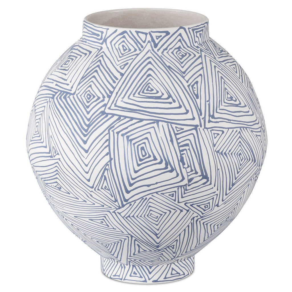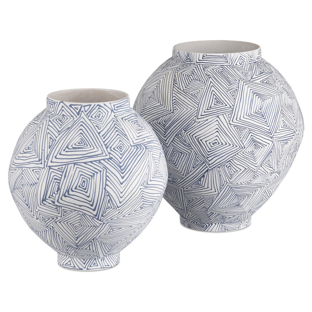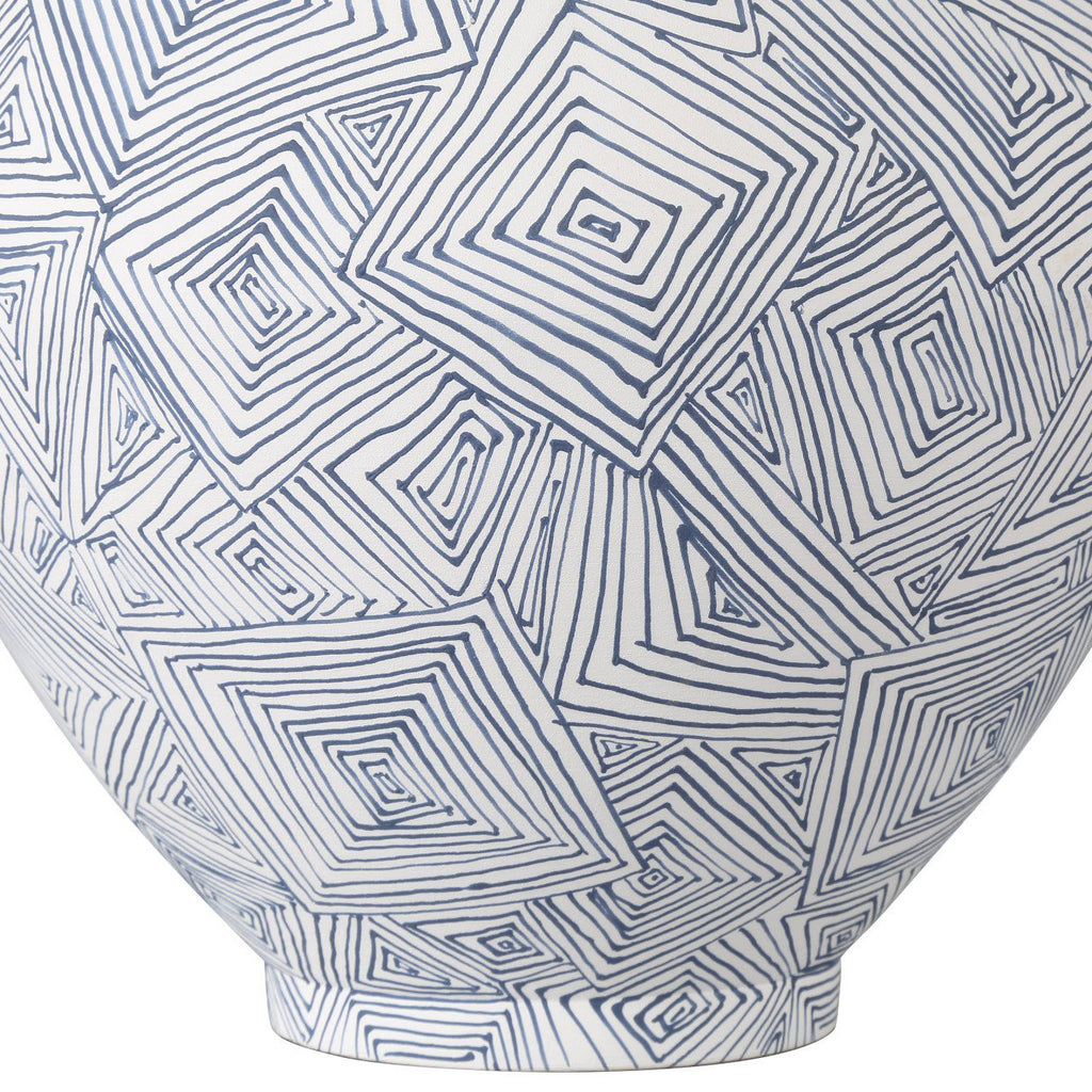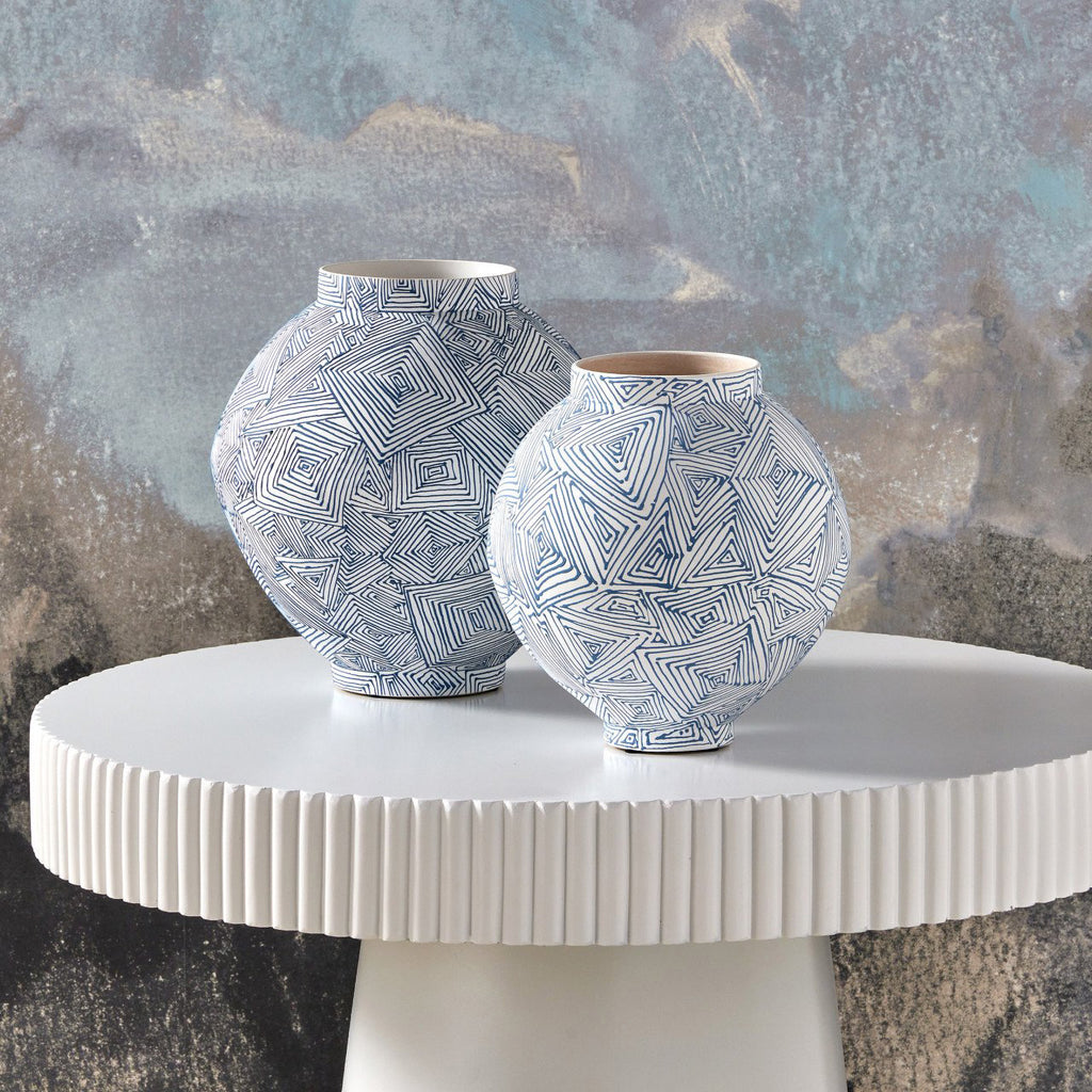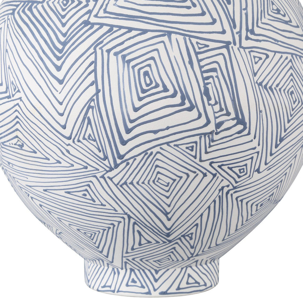 The Blue Zag Vase is made of hand-thrown porcelain that has been hand-glazed and decorated individually. The blue and white vessel is also glazed on the inside. The telescoping pattern on the surface, which was inspired by the art of Imperial Japan, is slightly raised to create an added element of artisanal craftsmanship to each piece, which will vary slightly from being handmade.