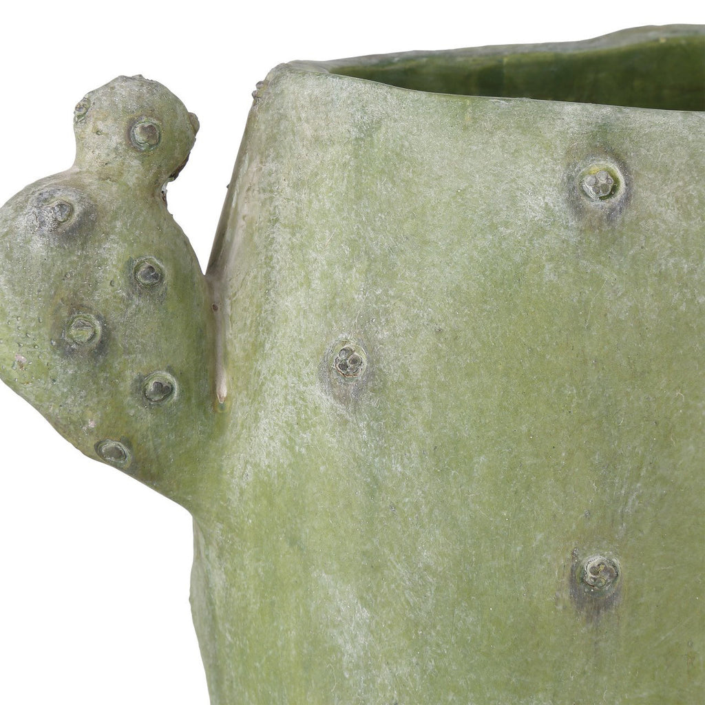The Cactus Vase Set includes three vases are made of composite to resemble cement. The vases are slathered in varying shades of green for an aged verdigris ombré effect, and the matte glazing, achieved by a dry finish, increases the patina of each of these accessories. The artisans who created these vessels hand-applied the finish, which means they will vary slightly from vase to vase.