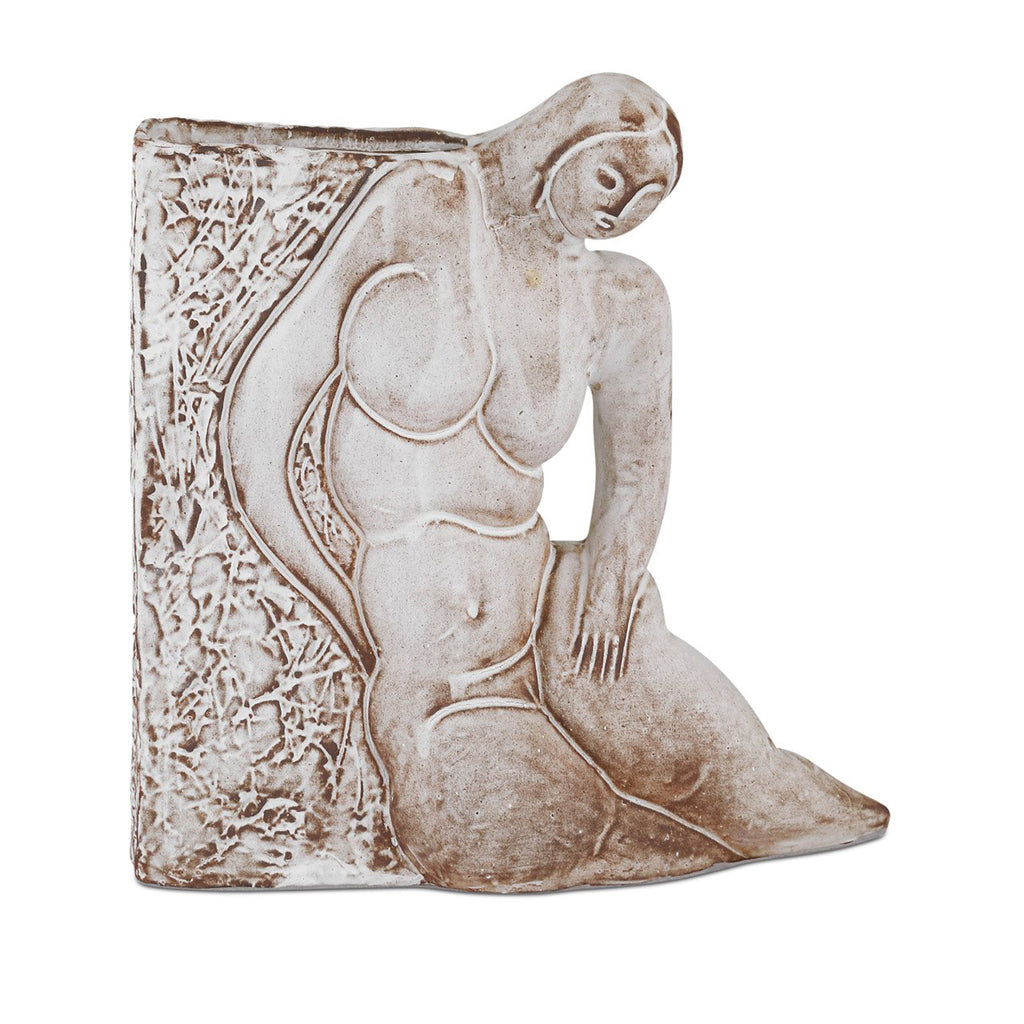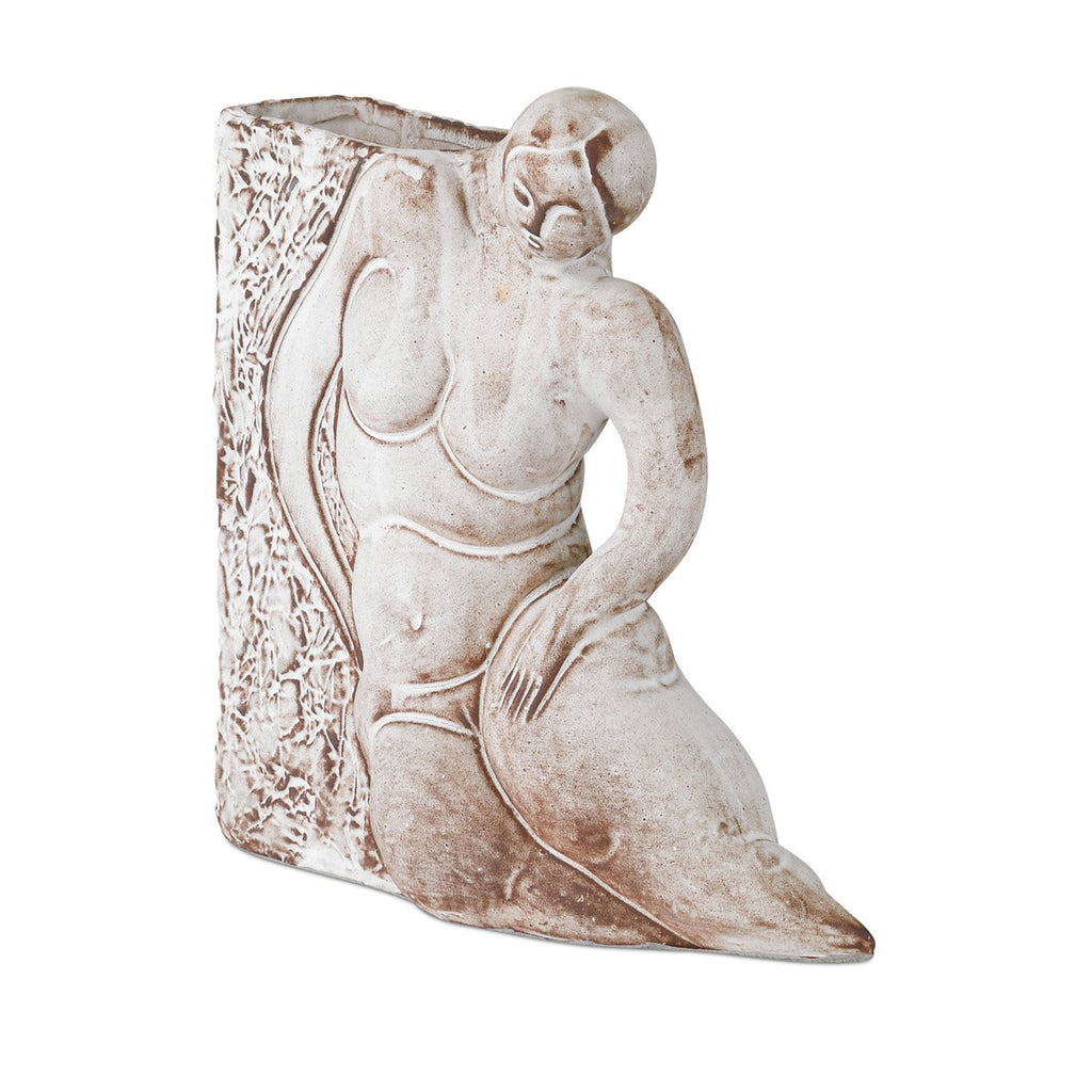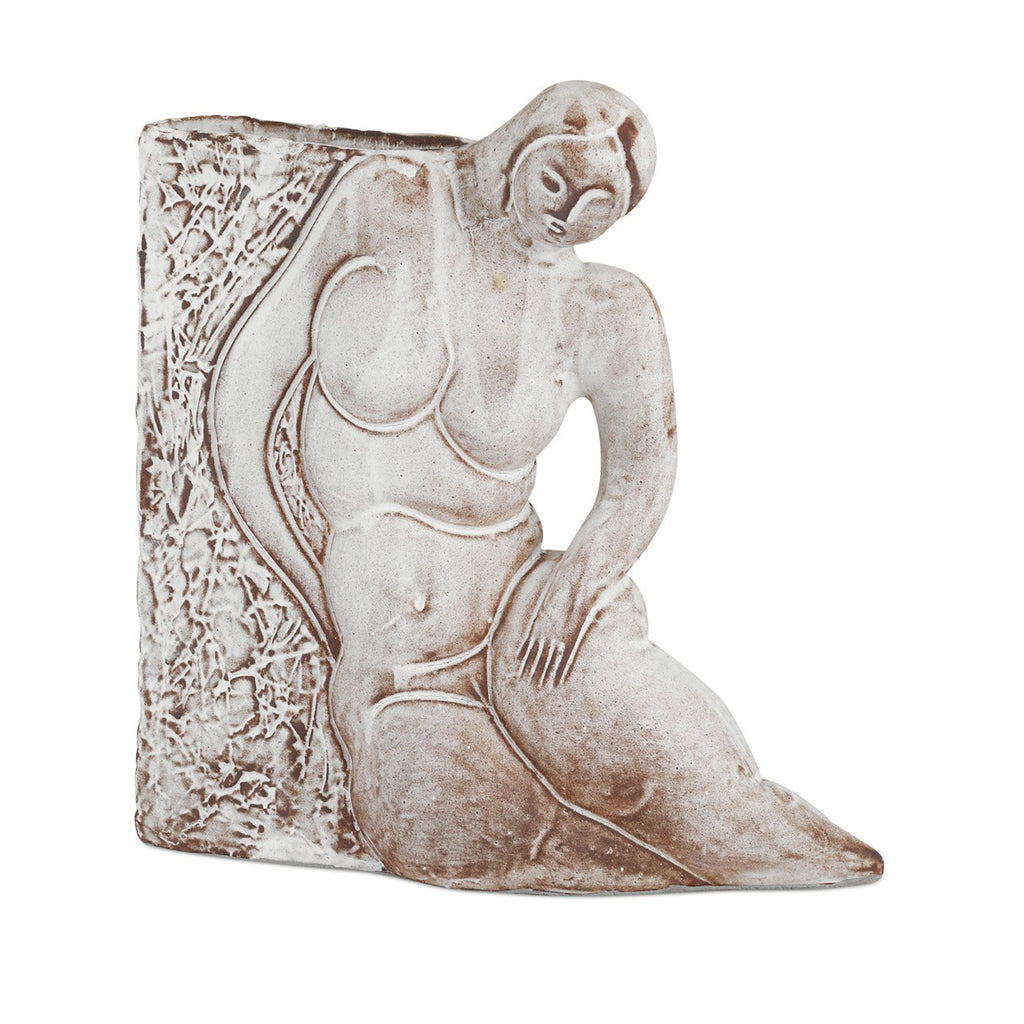 The Currey & Co Paramour Vase was inspired by the artistry of Henri Matisse. Made of porcelain, the expressive woman leaning into the vessel has a figure that feels as if it is moving. A white glaze is artfully applied so that it is thicker in some places than others to create a feeling of great texture.