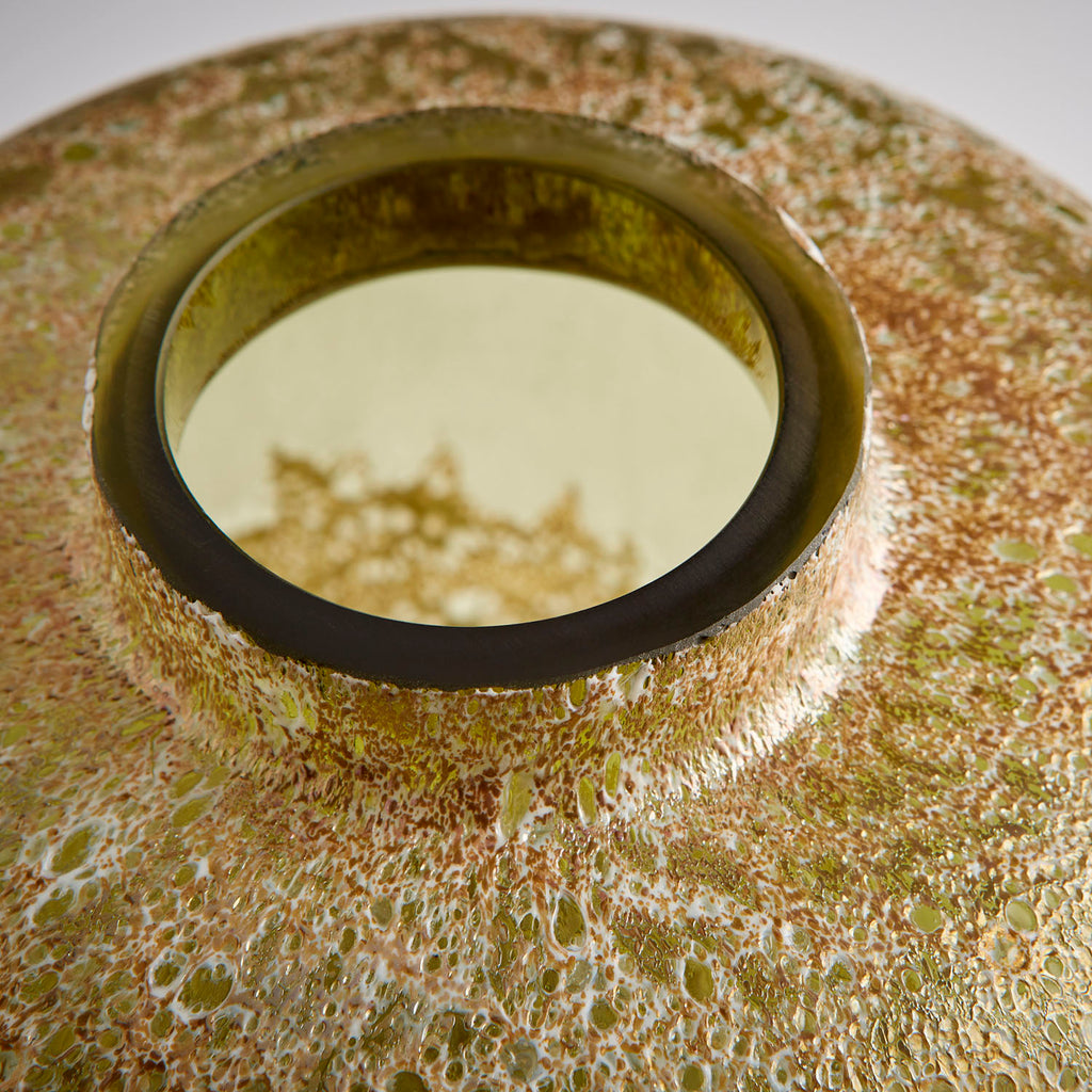 The Alkali vase features an alternating rugged, smooth textured surface in a Forest Stone (green) finish. A texture that is formed by mini explosions caused by the heat of molten glass reacting with a chemical catalyst. The irregularity in the exterior gives this glass vessel a certain rustic charm with a hint of natural splendor. The Alkali vases are constructed of durable, handblown glass affording them endurance in both quality and style.